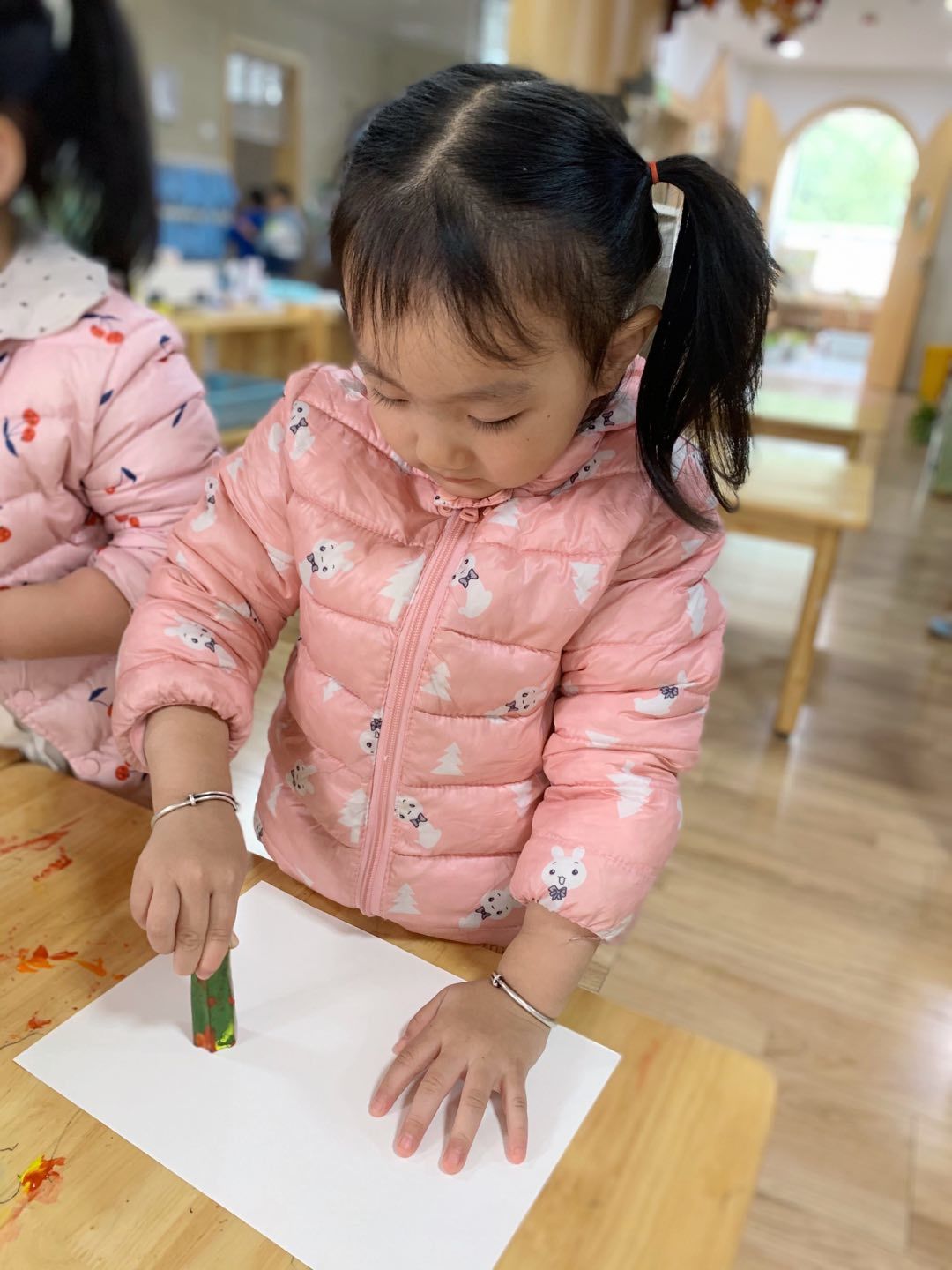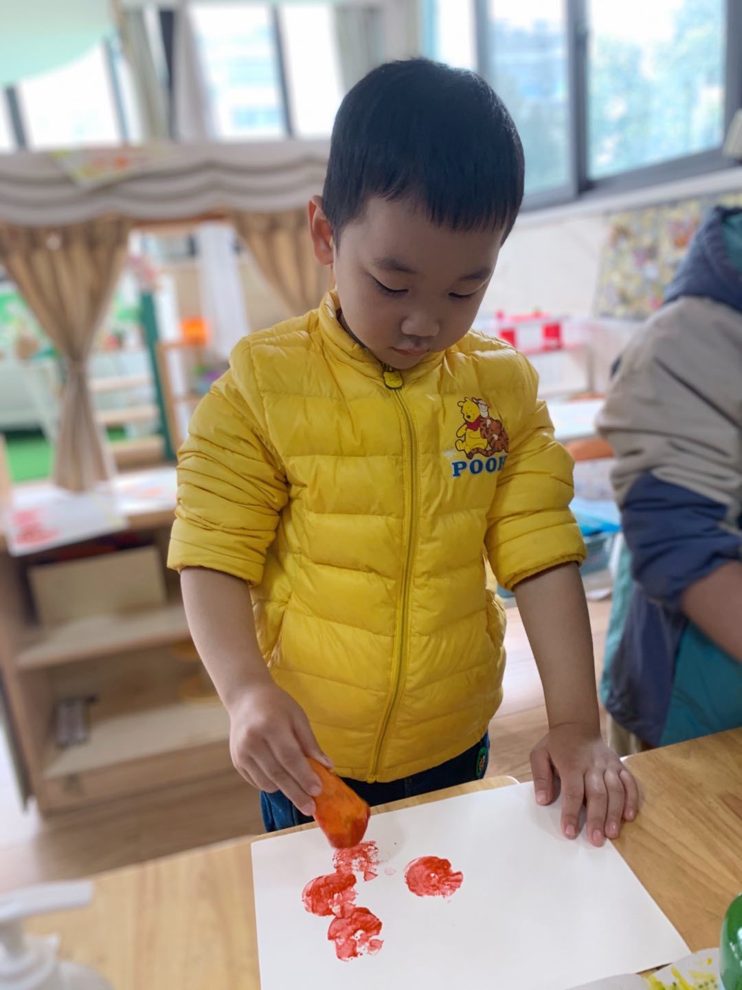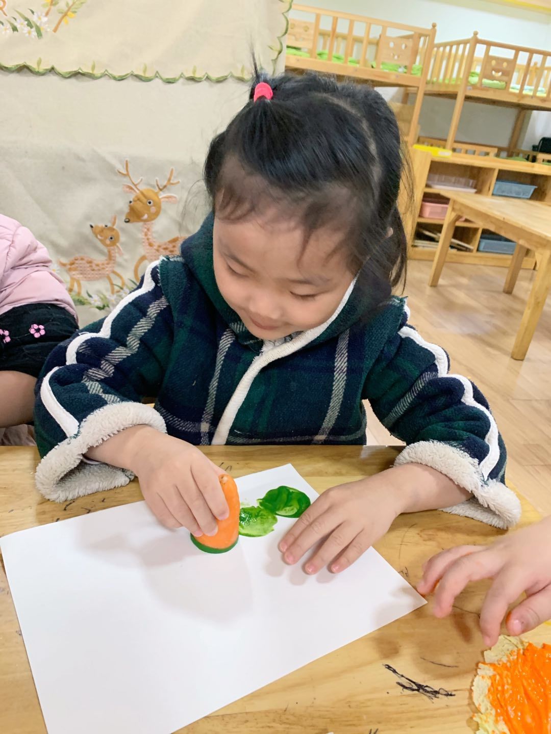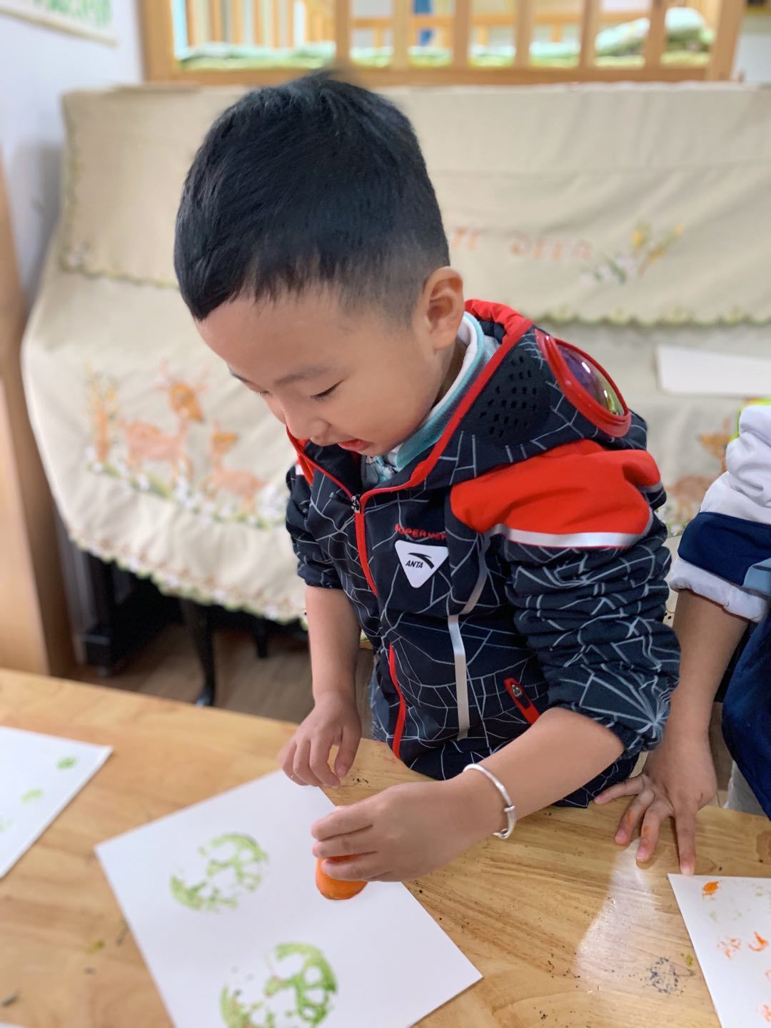 今天,我们使用塑料小刀将蔬菜宝宝们一切两半,这让我们发现了许多的惊喜呢!原来蔬菜切开的横截面还有这么多图案呢!芹菜从根部切开是玫瑰花的形状、秋葵切开是星星、莲藕切开是一个洞一个洞的呢!我们拿着横截面蘸取各种颜色的颜料进行拓印、添画,真是太好看了吧!