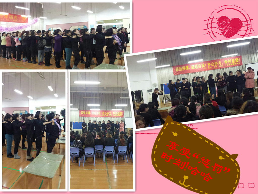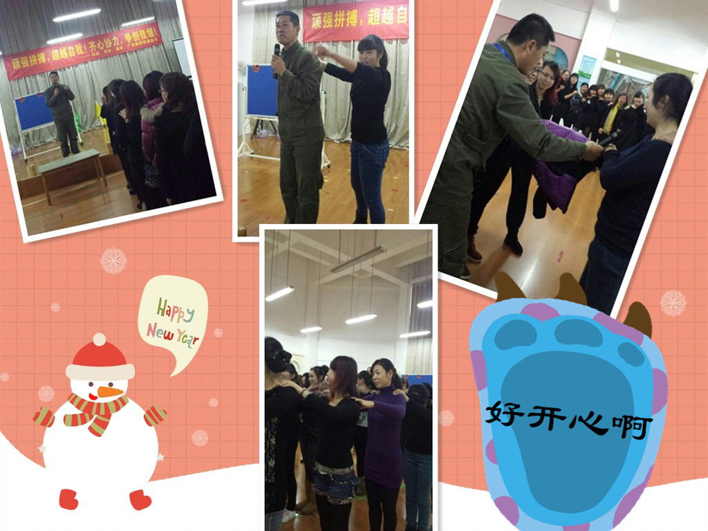 2014年元月3日,科幼、欣幼、盛幼、广幼的所有教师聚在欣荣幼儿园一楼多功能大厅进行了两个小时左右的拓展训练!在这两个小时里,老师们有竞争,也有合作!她们发挥了团队的精神,齐心协力,超越自己,荣获了很不错的成绩!