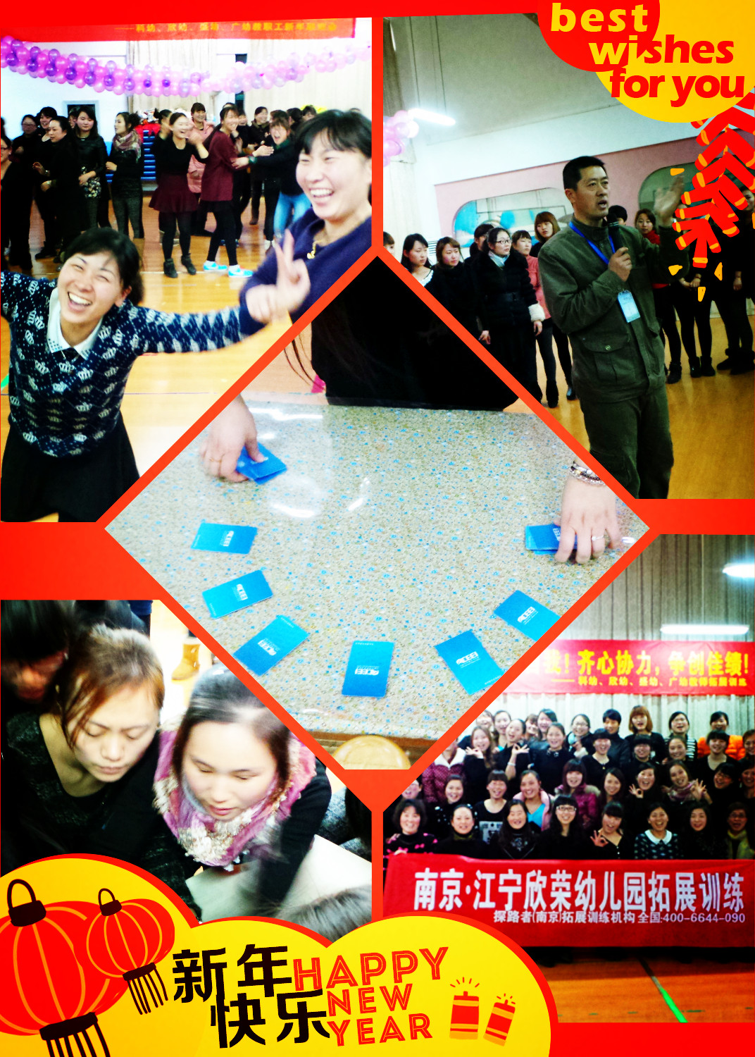 联欢会的第一个活动是教师的团队思维拓展训练,我们邀请了探路者拓展培训公司的廖教练当教官,在“翻纸牌”游戏中,教师们17人为一组,合作将反扣的纸牌按顺序从1-12数字和12属相排序好,大家共同讨论方法,现场竞争激烈,最后各组都取得了不错的成绩,接着的“合力制胜七巧板”的游戏,将全体78名教师分成了7组,每组先各自将七巧板按图示进行拼图,再听从第七组的指挥拼成正方形,最后整个大的团队也取得了较好的成绩。活动培养了教师们在小团队和大团队中“顽强拼搏,超越自我!齐心协力,争创佳绩!”的团队精神,也会将此精神带入到平时的工作中。
