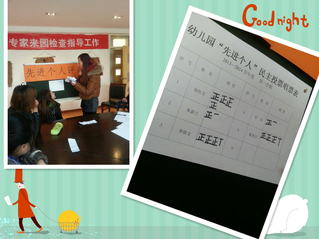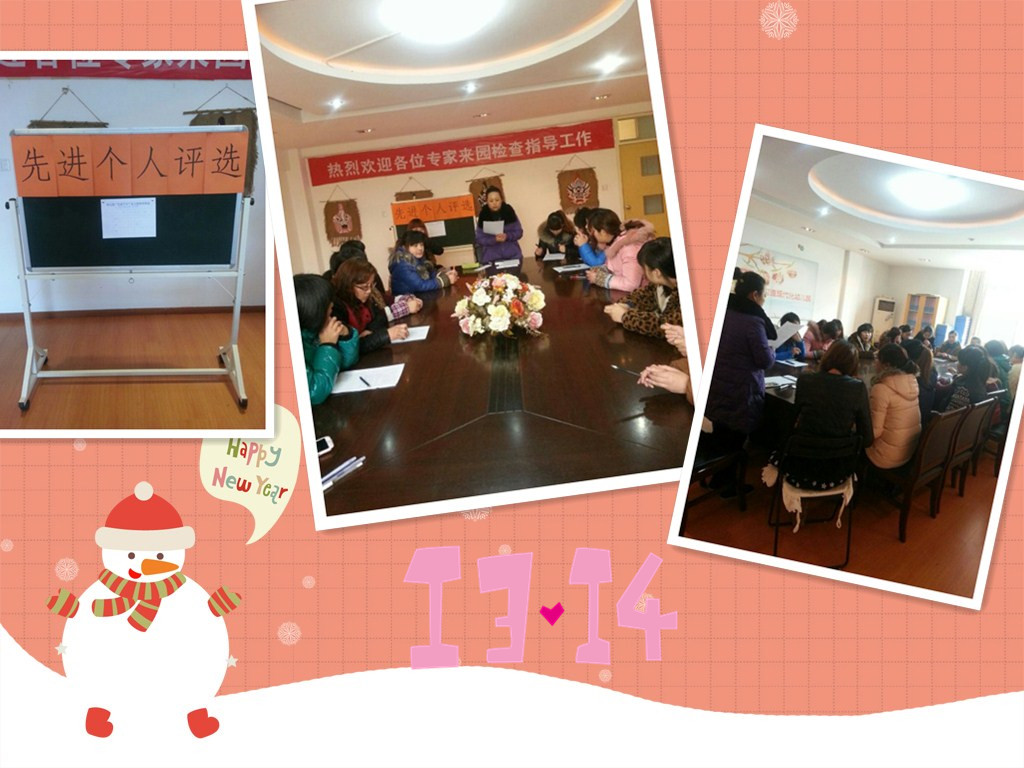 2014年1月17日(星期五)中午,我园所有教师齐聚欣荣幼儿园二楼教师会议室,在张海如园长的主持下公平公正地进行了2013年度教师组的先进个人评选。有五位教师进行了个人述职,最后在唱票中,选出了教师组三位先进个人:赵红玉老师、李继文老师、易美兰老师。祝贺她们!