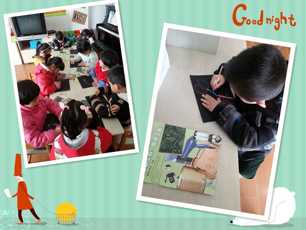 第五周的美术教学活动是:写生——理发工具!这次活动用的新型材料是刮画笔和刮画纸!小朋友都讲这个刮画纸是魔幻纸!特别的好玩!