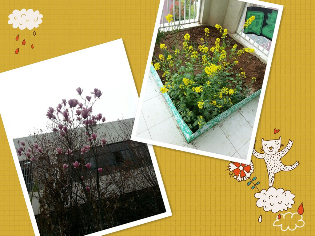 春天来了,幼儿园的花开了!我们班自然角里的青菜也开花了!黄黄的,真好看!