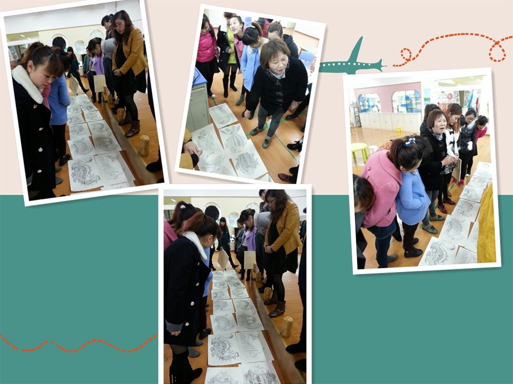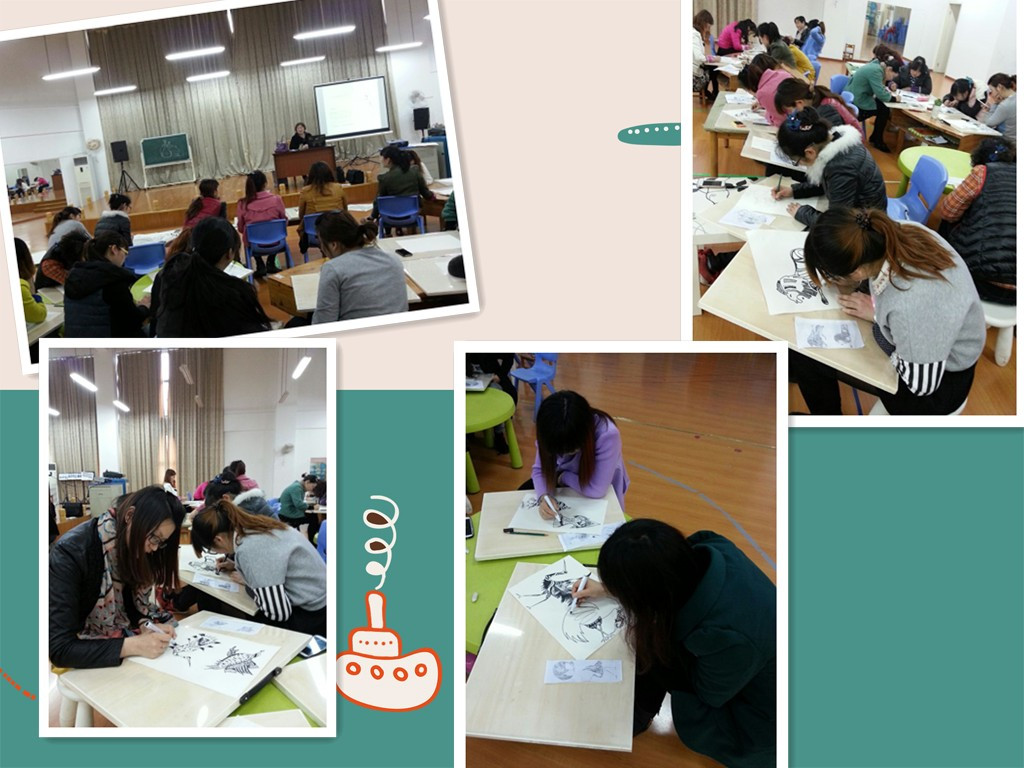 2014年3月25日周二,利用幼儿园教师业务学习的时间,进行了我园第二次线描装饰画的美术专题培训: