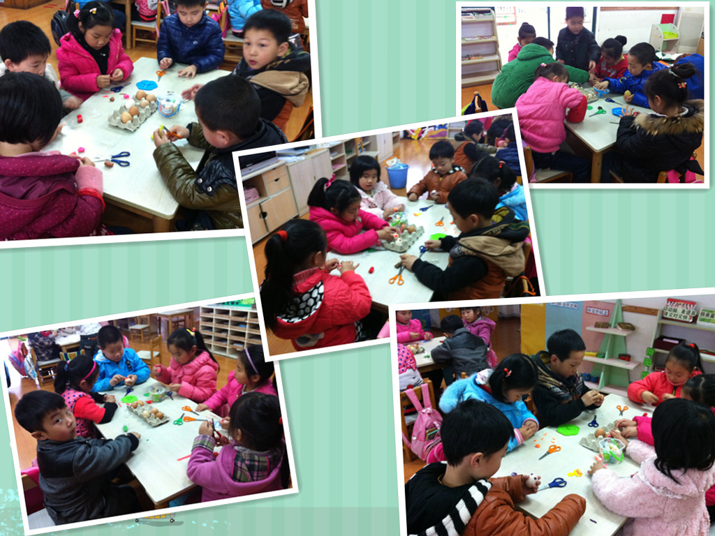 孩子们给自己带来的鸡蛋宝宝做漂亮的发型呢!瞧,一个个多认真呀,而且一个个还很有创意,和别人不一样的发型哦!