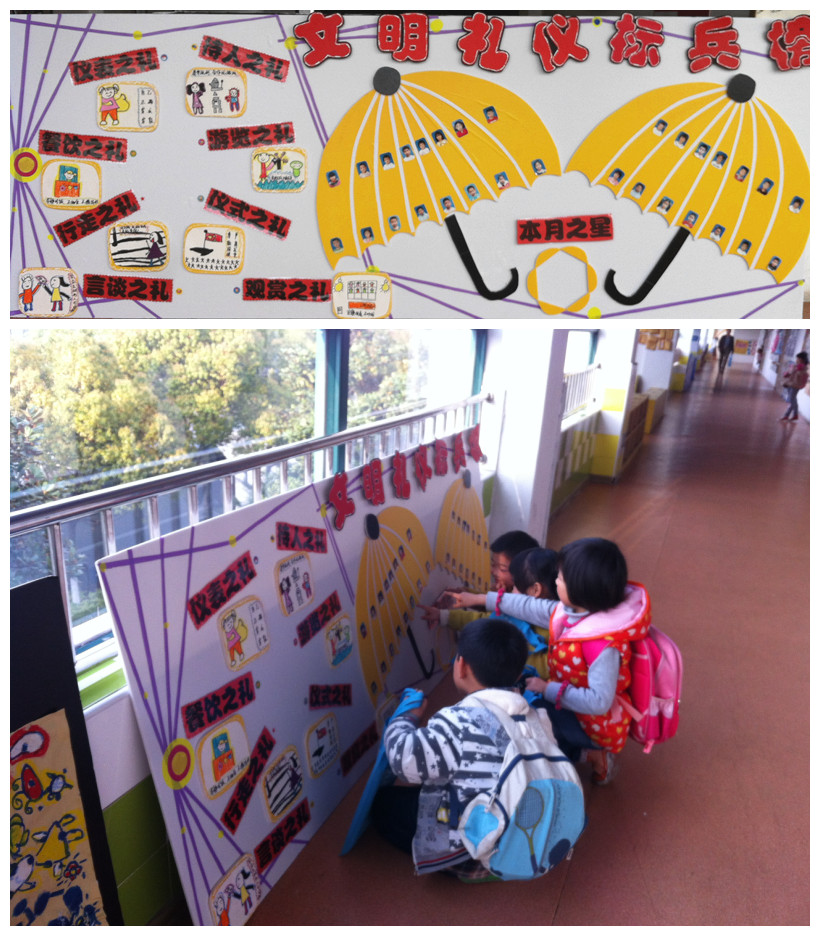 正当全省、市、区中小学、幼儿园掀起学习未成年人文明礼仪养成教育——“八礼四仪”的学习热浪时,为了引导未成年人崇德向善、崇尚文明,我们大四班也开展未成年人文明礼仪养成的教育,为此我们还做了展版。突出基本文明礼仪养成教育,融入“爱、善、诚、勤、俭、美”六种理念和价值取向,引导未成年人从小做起,学礼仪、知礼仪、行礼仪,努力成为品德高尚、富有理想、文明有礼、快乐健康、全面发展的新一代江宁人。