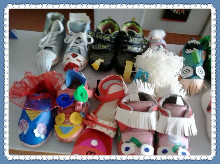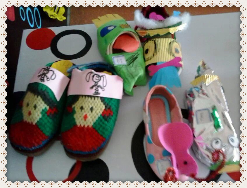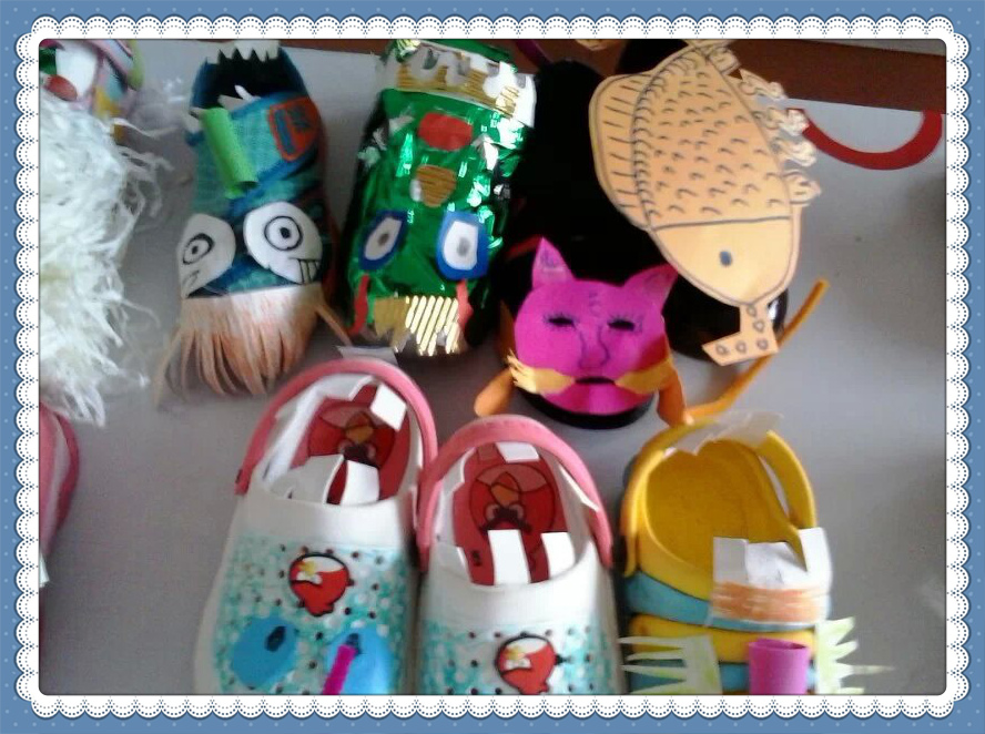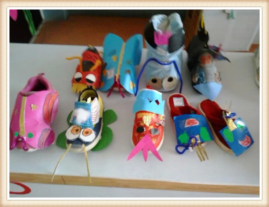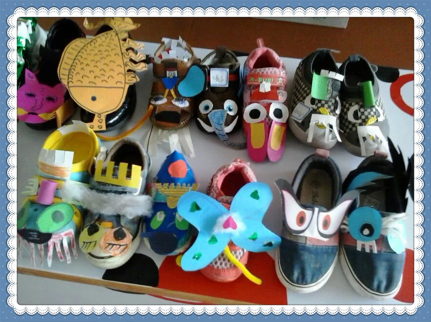 今天我们成长班进行了家长开放日活动,结合我园的美术特色,进行借形想象的美工制作《鞋子大变身》。