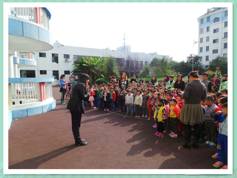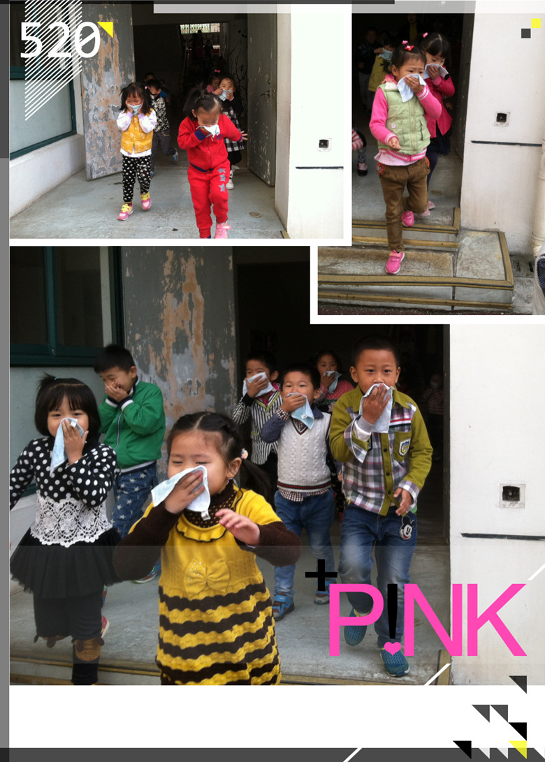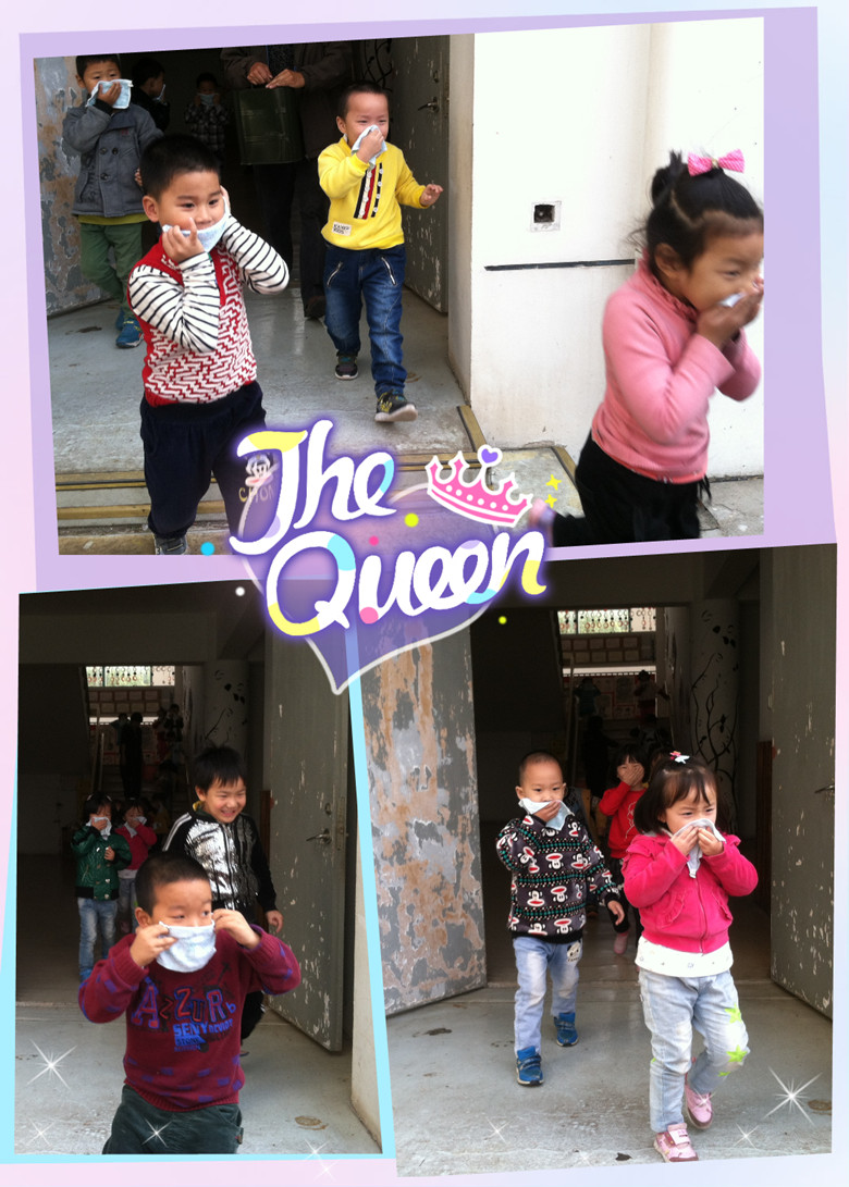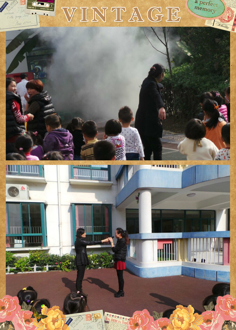 2014年11月7日上午10点整,幼儿园里的警笛声突然想了起来,随着一声:“着火了,快逃!”的叫喊声,紧接着,我们组织幼儿紧张有序的用毛巾捂着口鼻、低身靠墙,按指定的路线安全有序逃离了“火灾现场”,在指定地安全场地集合。