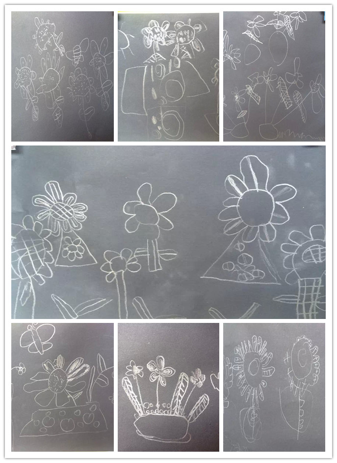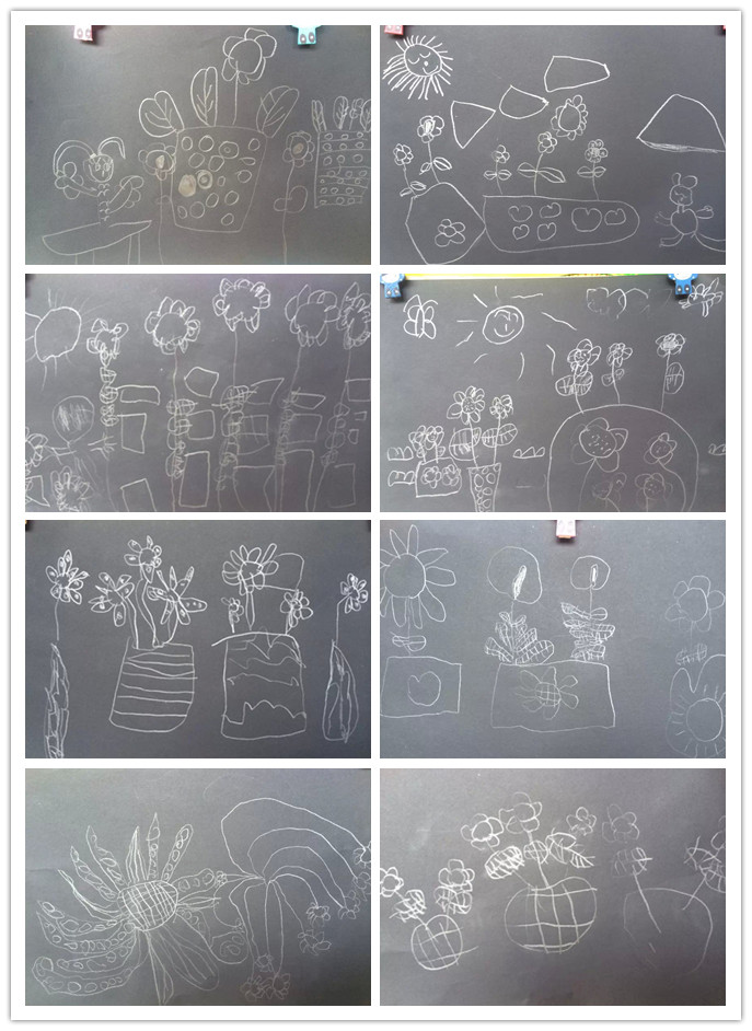 上周我们班开展的美术活动是一节写生活动,在让孩子观察真实的花卉植物的同时引导他们用写实的手法表达出来。一张黑色纸一支中性铅笔,便是孩子们的创作工具。一盆盆生动的植物花卉,激发了孩子们的创作灵感。这次的写生活动,也是我们为孩子们设计的第一次的写生活动。在写生活动中,孩子们尝试了这种新的绘画方式,那些对成人来讲是明显的相互的关系,对幼儿来说并非如此,他们只有通过观察才能积极地发现这些关系,并用自己喜欢的方式表达。仔细看,你们才会发现他们的妙笔如何生了花。