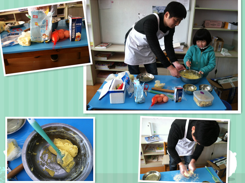 桌子上全部铺上保鲜膜,爸爸老师出示图片介绍今天活动内容制作《趣味小饼干》。
