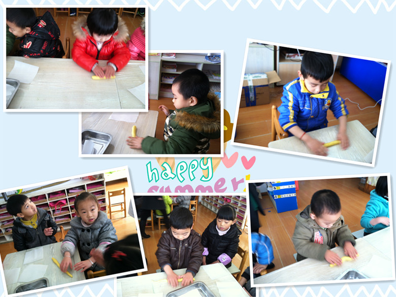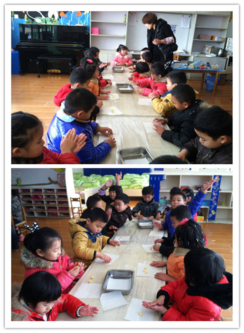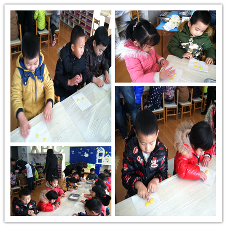 将打发好的面粉分成六份每一组一块面粉,同时选一位幼儿进行揉搓。搓好后再将面粉分成一块一块分到每位幼儿手里,开始制作。