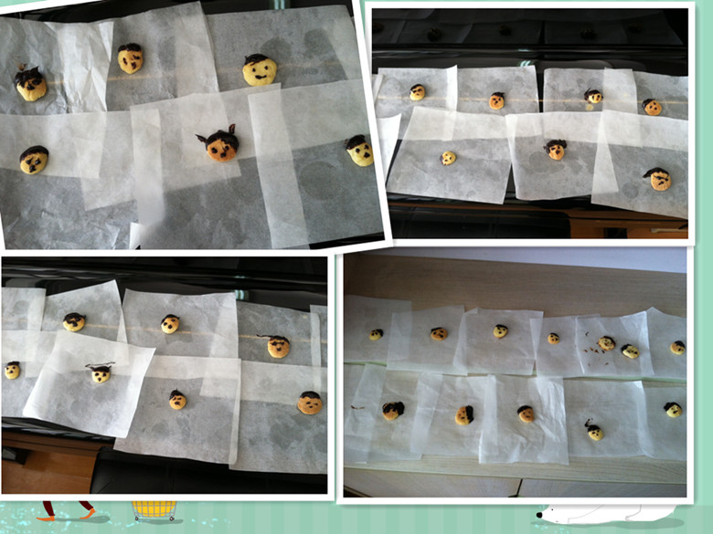 饼干的造型制作完成后,放进烤箱烤一烤,再将烤好的饼干用巧克力装饰一下。哇哦!好可爱的饼干就完成了。