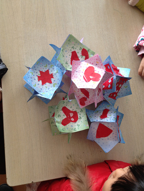 六面剪纸灯笼做好啦!这是小朋友们第一次合作的手工作品,孩子们在合作中学习,在合作中成长!