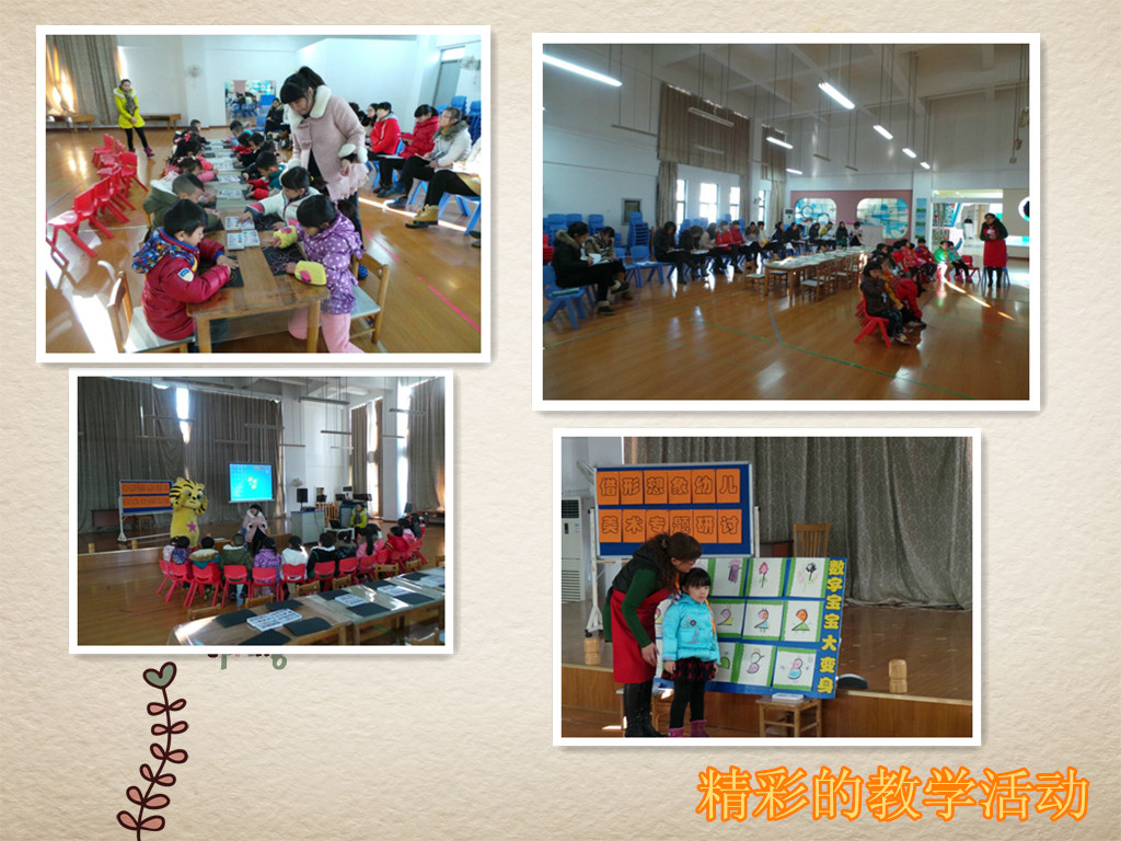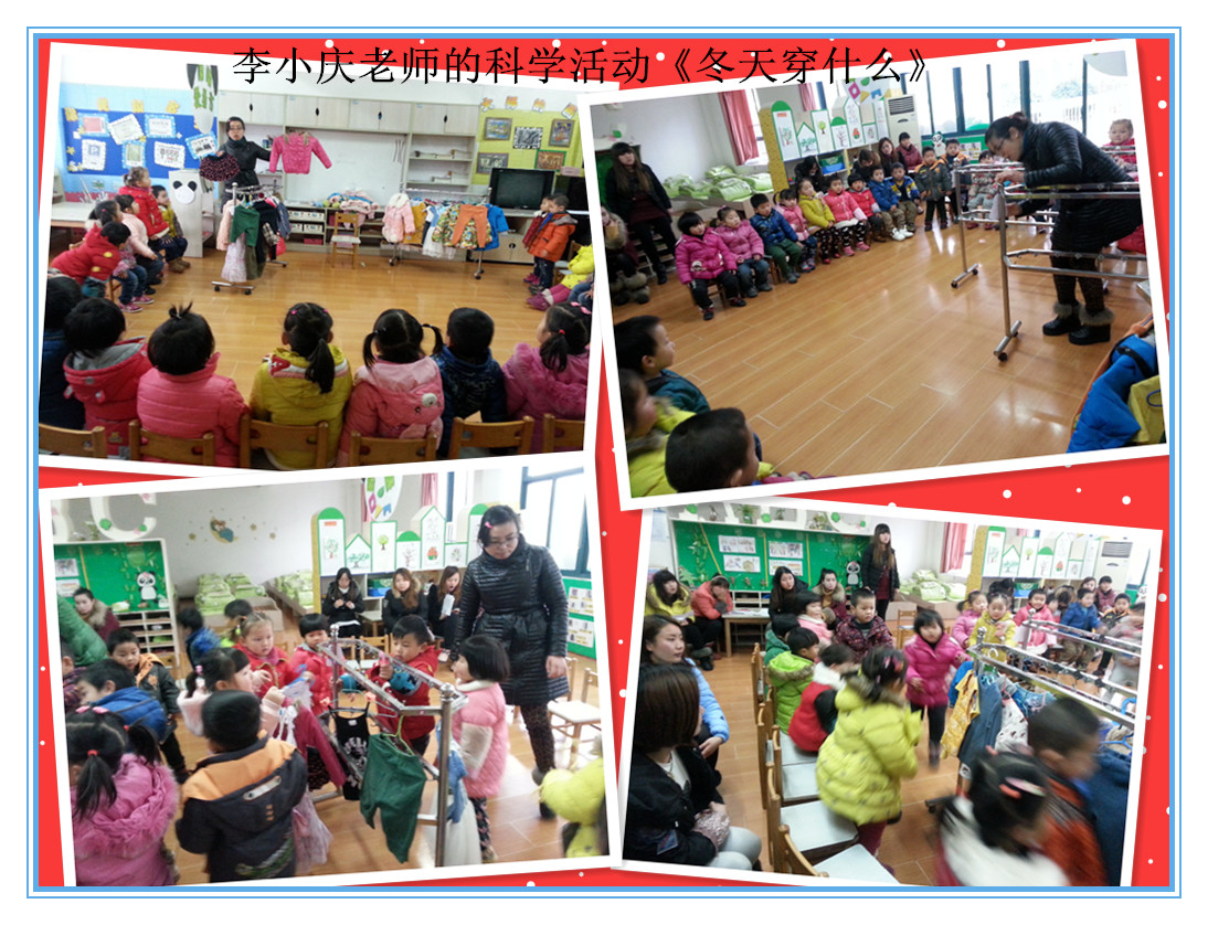 为充分发挥区、园级骨干教师的模范带头作用,近日欣荣幼儿园开展了区、园级骨干教师展示活动,区教科研带头人倪云芳在区内姊妹园和园内进行了专题讲座,区级骨干教师李小庆在园内讲座并展示小班的科学教学活动《冬天穿什么》,结合生活让幼儿知道了冬天需穿的衣服,并对四季衣服进行了分类;区“教坛新秀”芦丽萍和张巧玲分别展示了美术和音乐活动;园级骨干平凡展示了小班的体育教学活动《小鸡捉虫》通过游戏情境,提高了幼儿快跑能力;园级骨干易美兰展示了中班的美术教学活动《新年画册》孩子们感知了每个季节的不同色彩并用油水分离的方法表现了不同季节的基本色调;园级骨干赵红玉展示了小班的美术教学活动《数字变变变》,孩子们借形想象,将数字变成各种物体,想象力得到充分发挥。