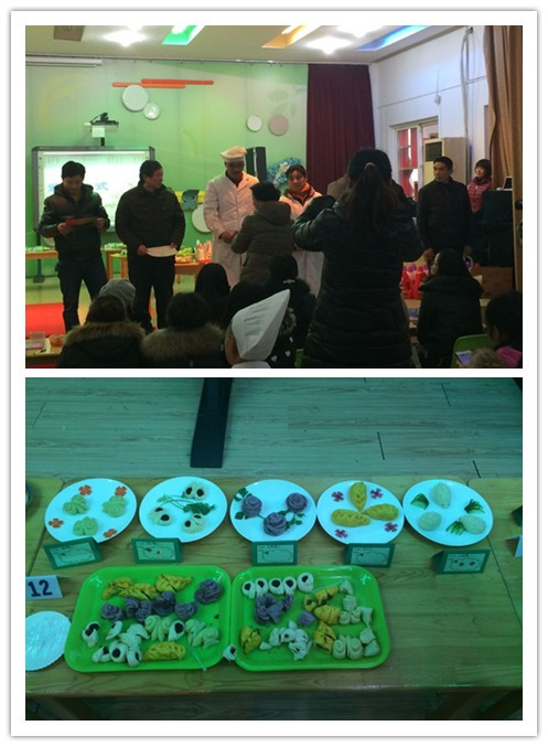 为丰富幼儿膳食,进一步办出特色,提高我园幼儿伙食管理的质量,百家湖片12幼儿园开展了食堂面点制作比赛。欣幼的2位食堂工作人员许友明和李霞参加了比赛,比赛要求参赛人员自己配料,根据幼儿年龄特点创作花色新颖的点心。从面粉的发酵、粉团的揉和、肉馅的配料、点心的制作,参赛人员都做了精心的准备。在轻松愉悦的气氛中,参赛厨师个个精神抖擞,亮出自己绝活,不到1个小时的比赛时间内,厨师做出了玫瑰花、枣花馒头、小兔包、刺猬包等多种的花色面点,评委们对厨师精湛的手艺赞叹不已。