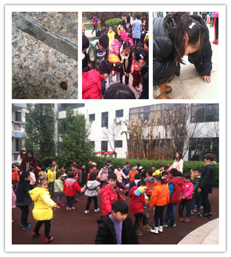 每天起床后,我们都会到户外进行有趣的户外活动。今天,我们中班的哥哥姐姐们和小一班的弟弟妹妹们一起手拉手围成了两个圆一起玩相反游戏,大家玩得好开心呀?在游戏后,有小朋友意外发现了一个七星瓢虫,孩子们兴奋极了,都纷纷围了过来观察它,有的小朋友忍不住都要摸摸它哦!