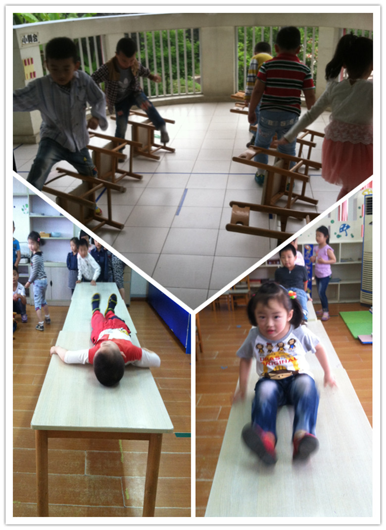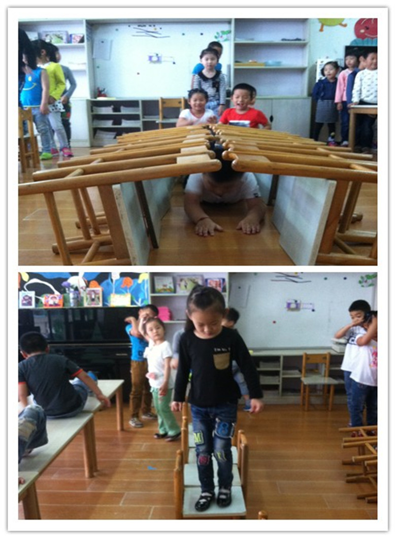 轻音乐在孩子们陆陆续续入园时开始缓缓地演奏起来,在这持久的阴雨天里去室外活动已成了一种奢望,我们利用教室内的桌椅和教室内每一块场地,挖掘多种玩法,开展多种多样,丰富有趣的晨锻活动。瞧!每块空间都有孩子们跃动的身影,利用小椅子练习平衡、钻山洞等都能让幼儿如此的开心。教室外走廊上跨椅子,也能成为发展孩子动作技能的场地,孩子们在老师的奇思妙想中运动着、快乐着!