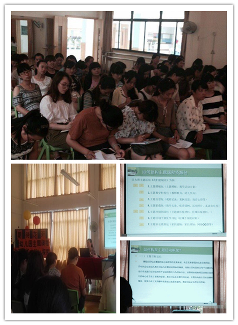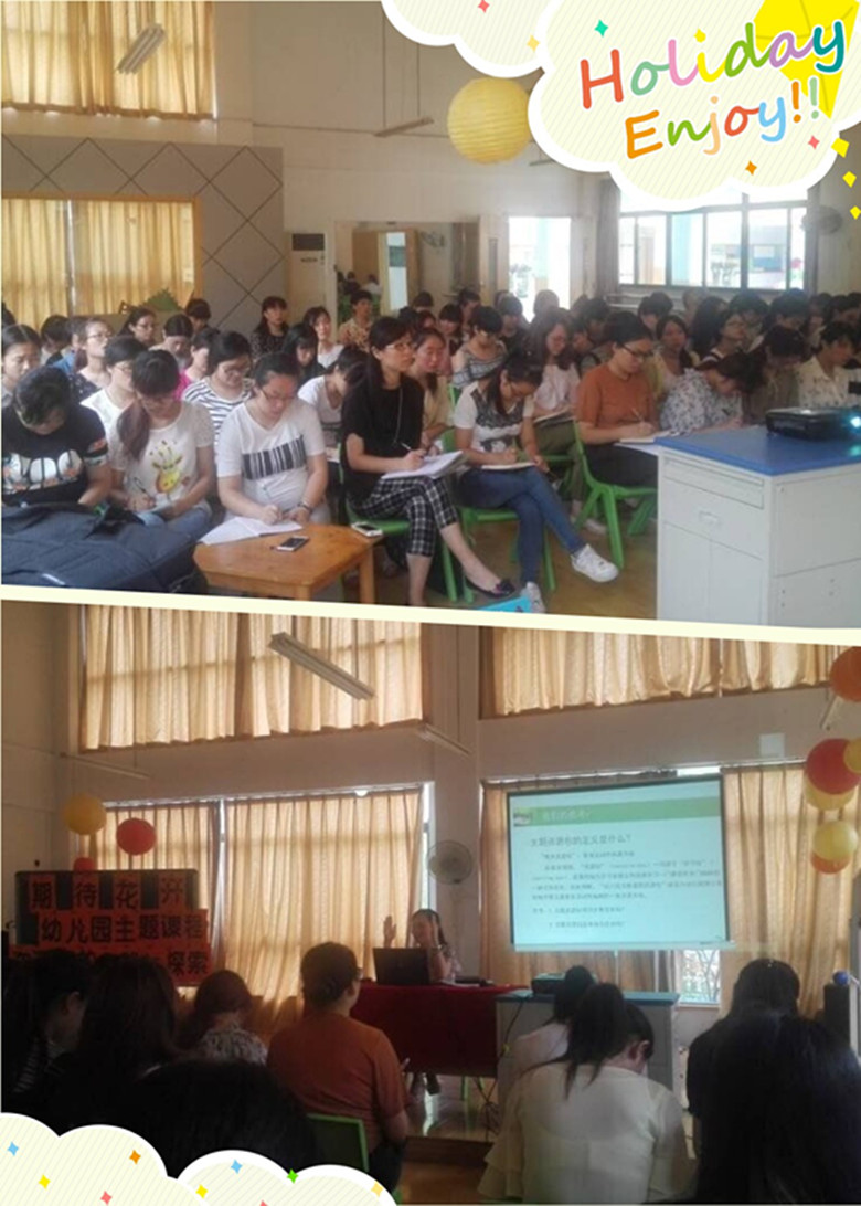如何巧用资源,开展教学活动,使其活动更适宜呢?2015年6月24日姊妹园盛乐幼儿园邀请了竹山幼儿园宫云菲园长进行了《期待花开—幼儿园主题课程资源包的实践与探索》菜单式讲座。在杨园长的主持下精彩地开展,宫园长从几下几点细致地向我们介绍如何做好主题资源包:1.为什么要构建主题课程资源包;2.利用案例详细地解说了她们是如何制作资源包的;3.如何构建主题活动框架。4.我们的感受。
