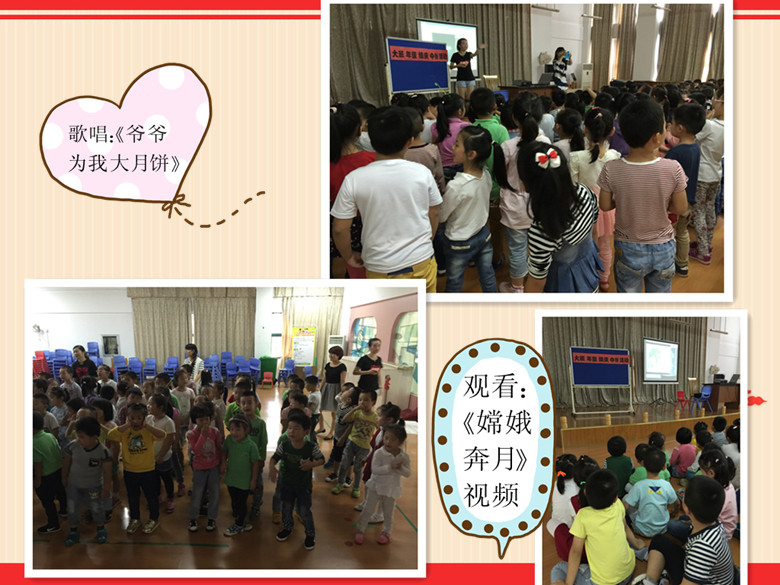 我们大班年级组所有师生在一起观看了视频《嫦娥奔月》;演唱了儿歌《爷爷为我打月饼》;在一起分享了月饼,体验分享的乐趣。
