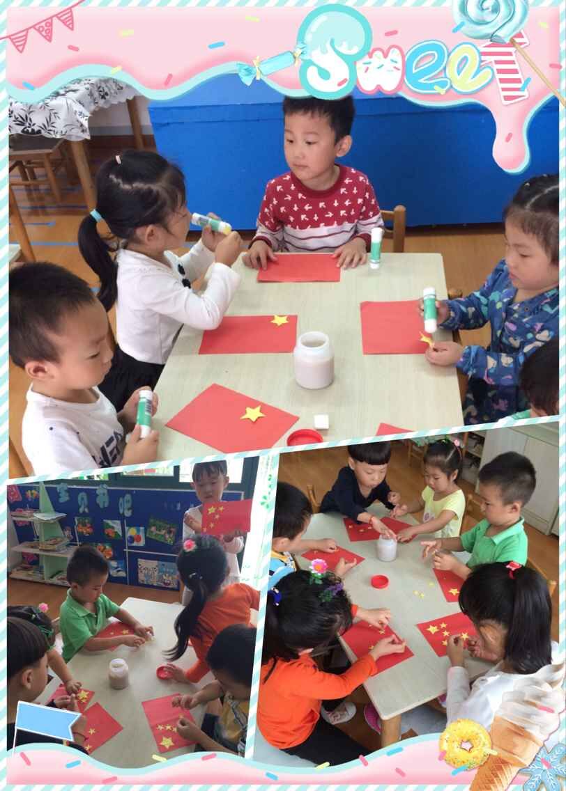 国庆节即将来临,小朋友们也在自己动手做国旗,表达自己的爱国之情哦!看,我们的孩子们正认真的粘贴五角星,把每一个五角星都贴的整整齐齐!