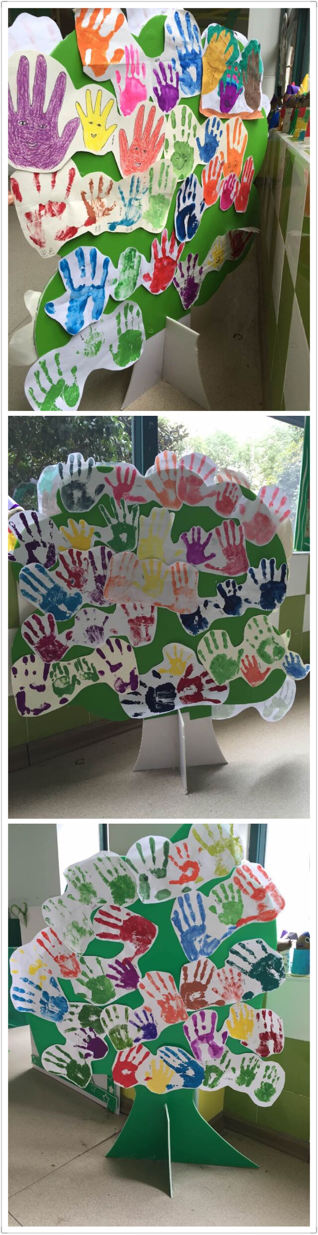 由于课程的需要,老师布置了亲子作业,就是宝宝和爸爸妈妈印手印,当接到这个作业时孩子们很兴奋,可以回去和爸爸妈妈玩颜色、玩颜料咯!家长们的参与度还挺高,纷纷交来作业,有的还是一家四口的手印,非常温馨有爱!老师把家长带来作业也粘贴到了亲情树上,并展示在班级走廊上!