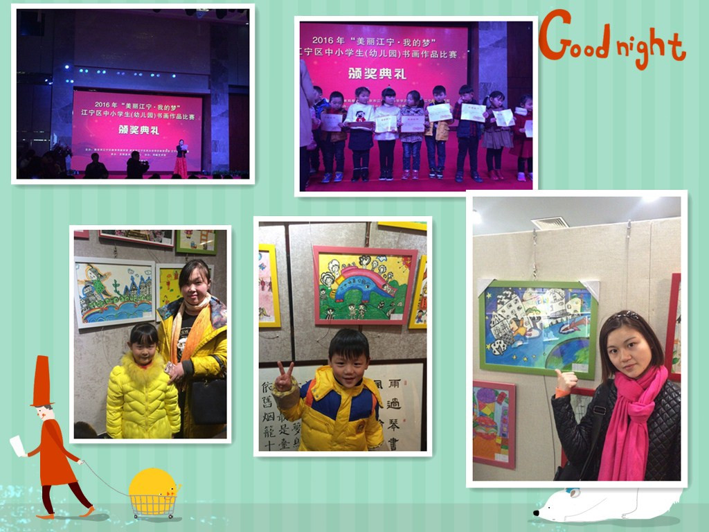 由江宁区教育局教研室、江宁区民办非学历教育协会、江宁教育书画院主办的2016年“美丽江宁﹒我的梦”江宁区中小学生(幼儿园)书画作品比赛,于2016年1月9日在江宁瑞都广场6楼艺术厅举行颁奖典礼,我园部分家长和幼儿上台领奖!还有我们小朋友的多幅作品展出哦!