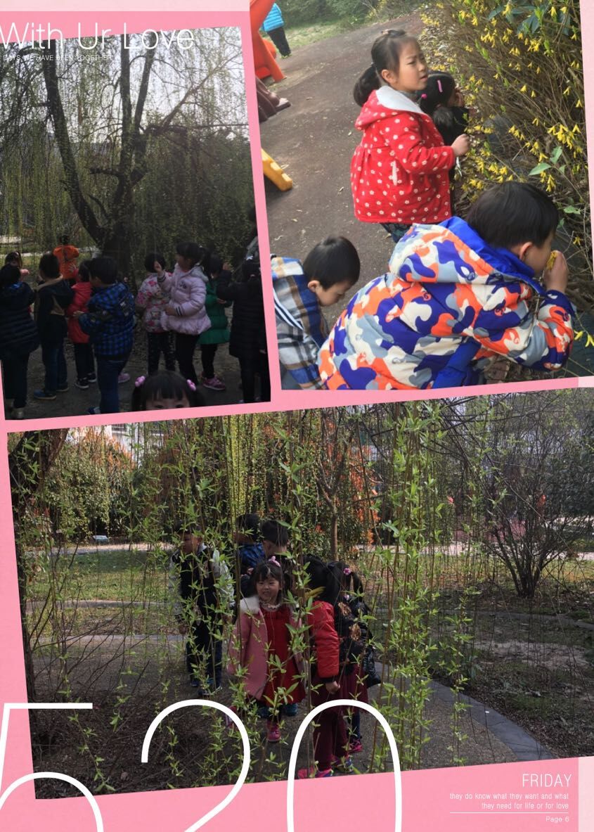 春天在哪里啊?春天在哪里?春天在那小朋友的眼睛里……小朋友们找到春天咯!飘逸的柳条,美丽的迎春花,春天就在我们的欣荣幼儿园里!