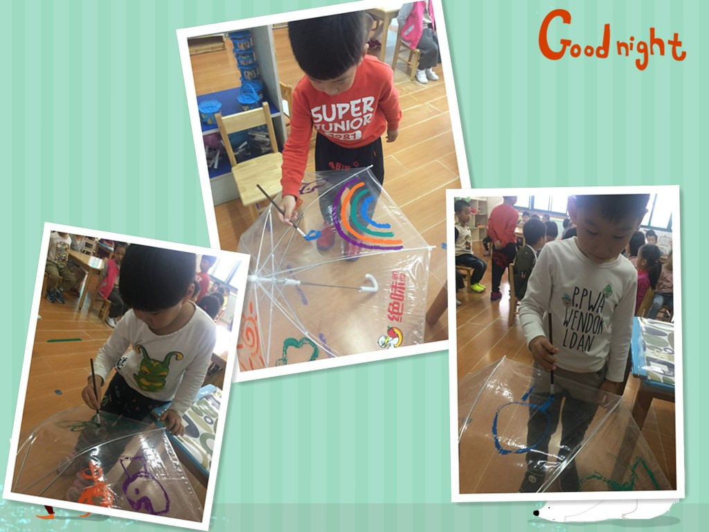 本周我们对伞进行了许多创意彩绘哦!小朋友们都为小伞添画上了美丽的图案哦!快看看吧!