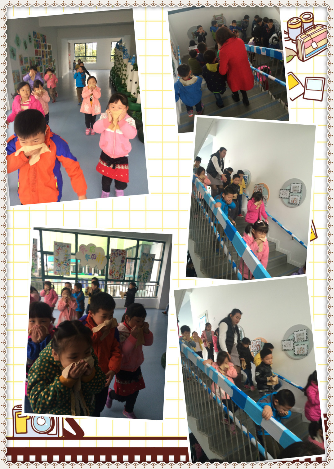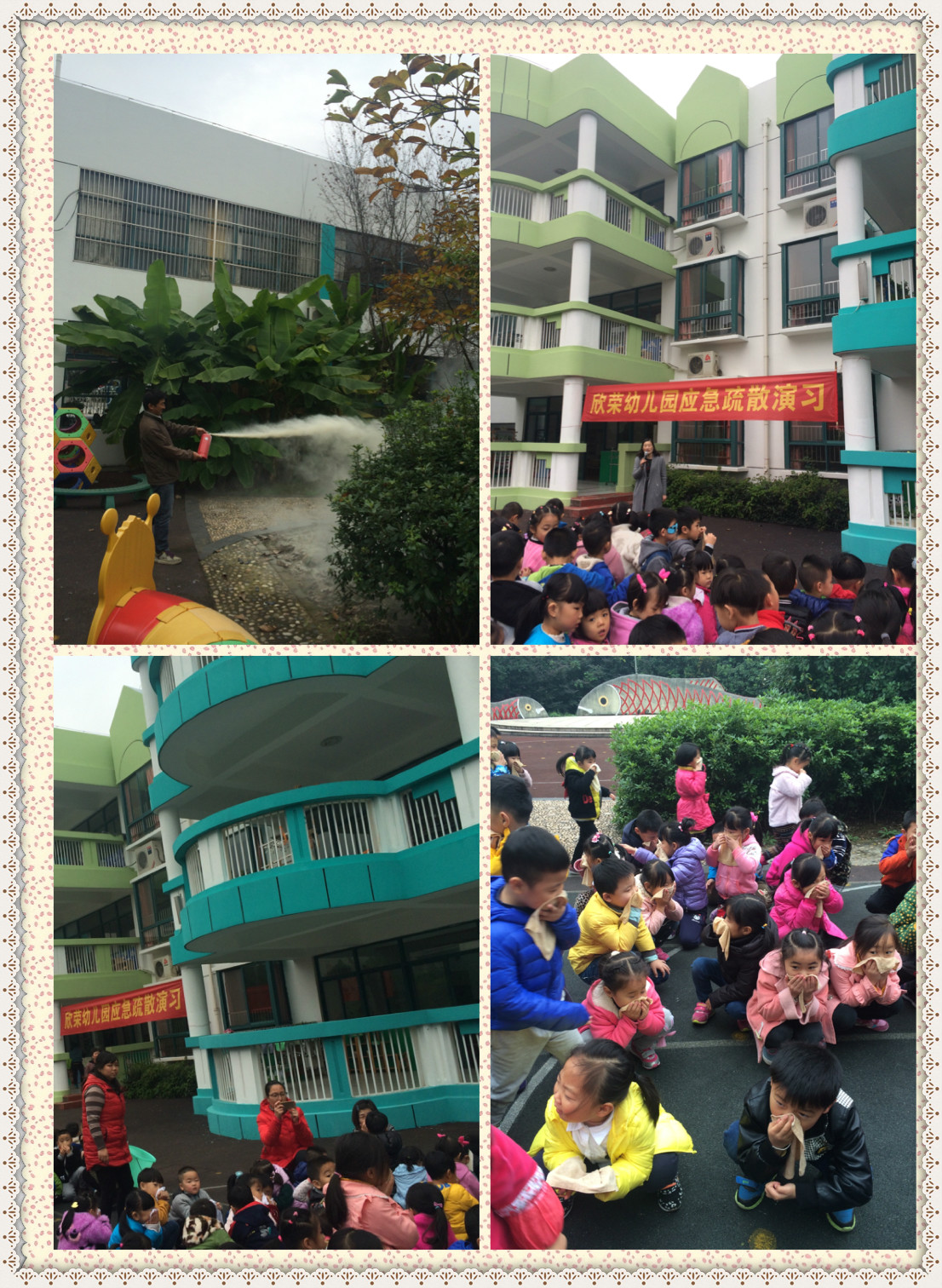 11月9日(消防安全日)幼儿园举行了消防演习,园长妈妈的带领和指挥下,老师和小朋友顺利通过演习。瞧,我们大一班的小朋友听到警报声,立即拿着湿毛巾捂住嘴巴,并弯着腰有序地从三楼来到了一楼操场。最后,园长妈妈还告诉我们许多逃生的方法,我们学到了很多自我保护的知识和本领