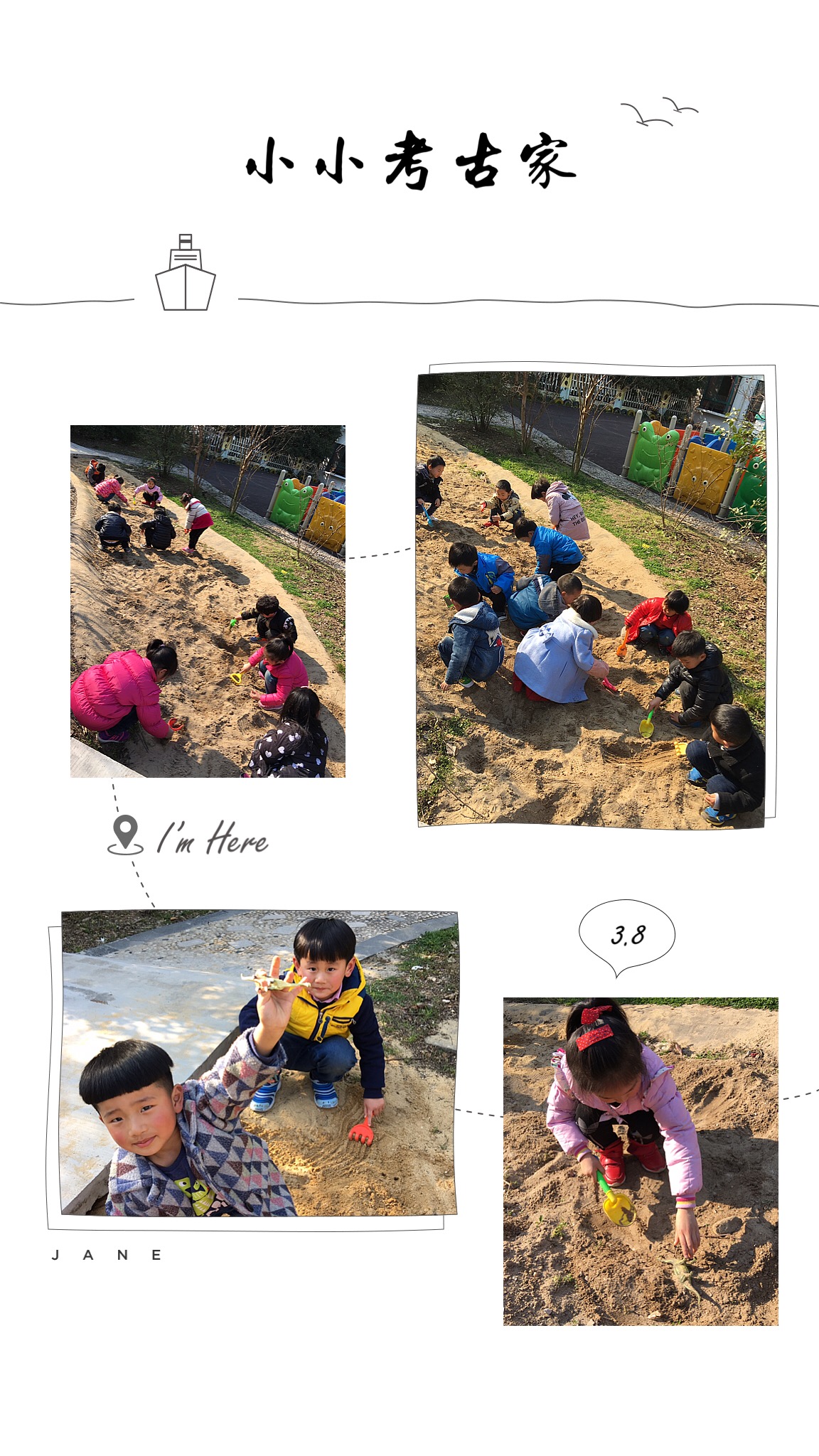 今天宝贝们当起了小小考古家,拎着小工具,大步走进沙池,一个个埋头认真仔细的挖掘着,原来考古是这么的不容易啊! 怎么样~你想加入我们吗!