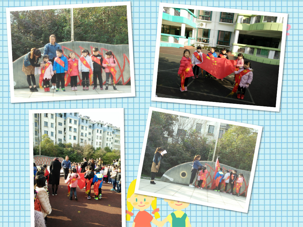 今天的升旗仪式是由我们班的小朋友来做升旗手和护旗手的,升旗手是付晨熙和孙一诺小朋友,护旗手是朱明轩、王羽涵、王允昊和张靖瑶小朋友,这几位小朋友都是平时很积极的小朋友,他们能团结友爱其他小朋友,也能热心的帮助老师做一些力所能及的小事,他们都很棒哦!加油!下面就让我们一起走进现场看看吧!