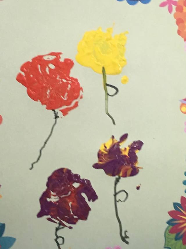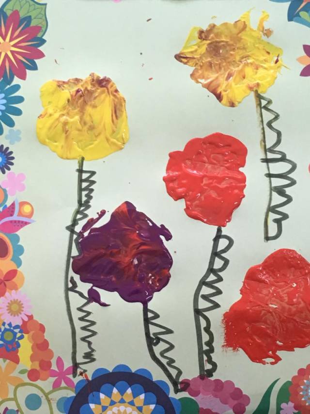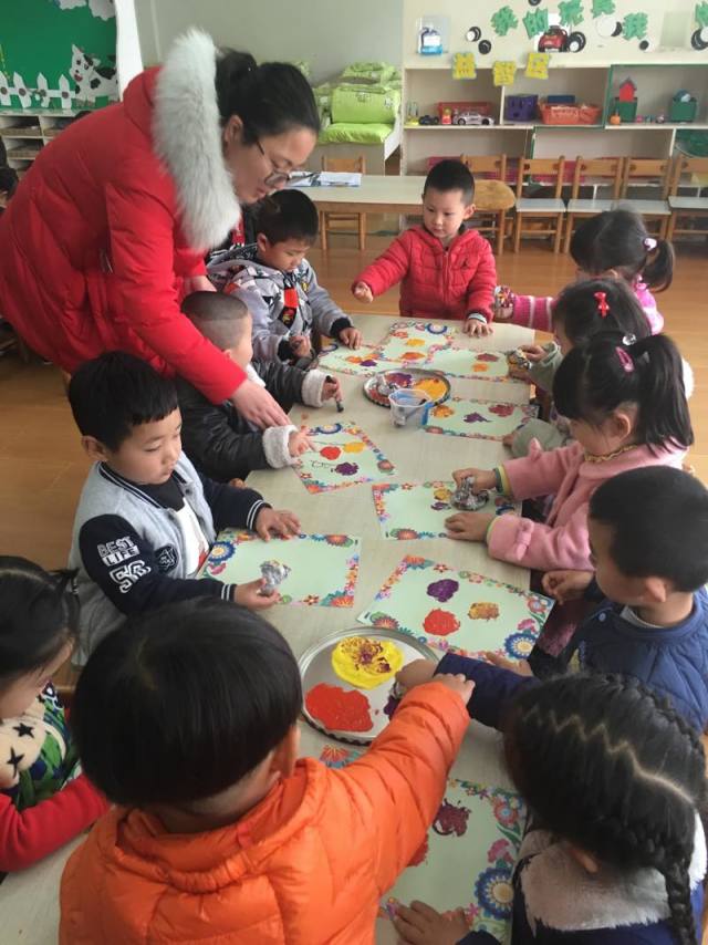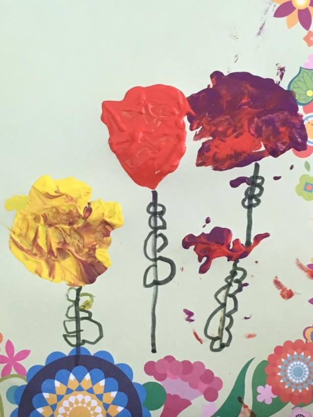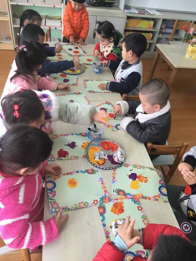 哈哈哈,今天我们班上来了一位花仙子,你们猜猜是谁?她就是我们的园长妈妈,。我们很有礼貌地和园长妈妈打招呼,怎么样,我们是不是很棒啊?点个赞吧!老师教会我们怎样拓印漂亮的花儿,小朋友们学的可认真啦,看看我们的作品吧!一个字:美美美!