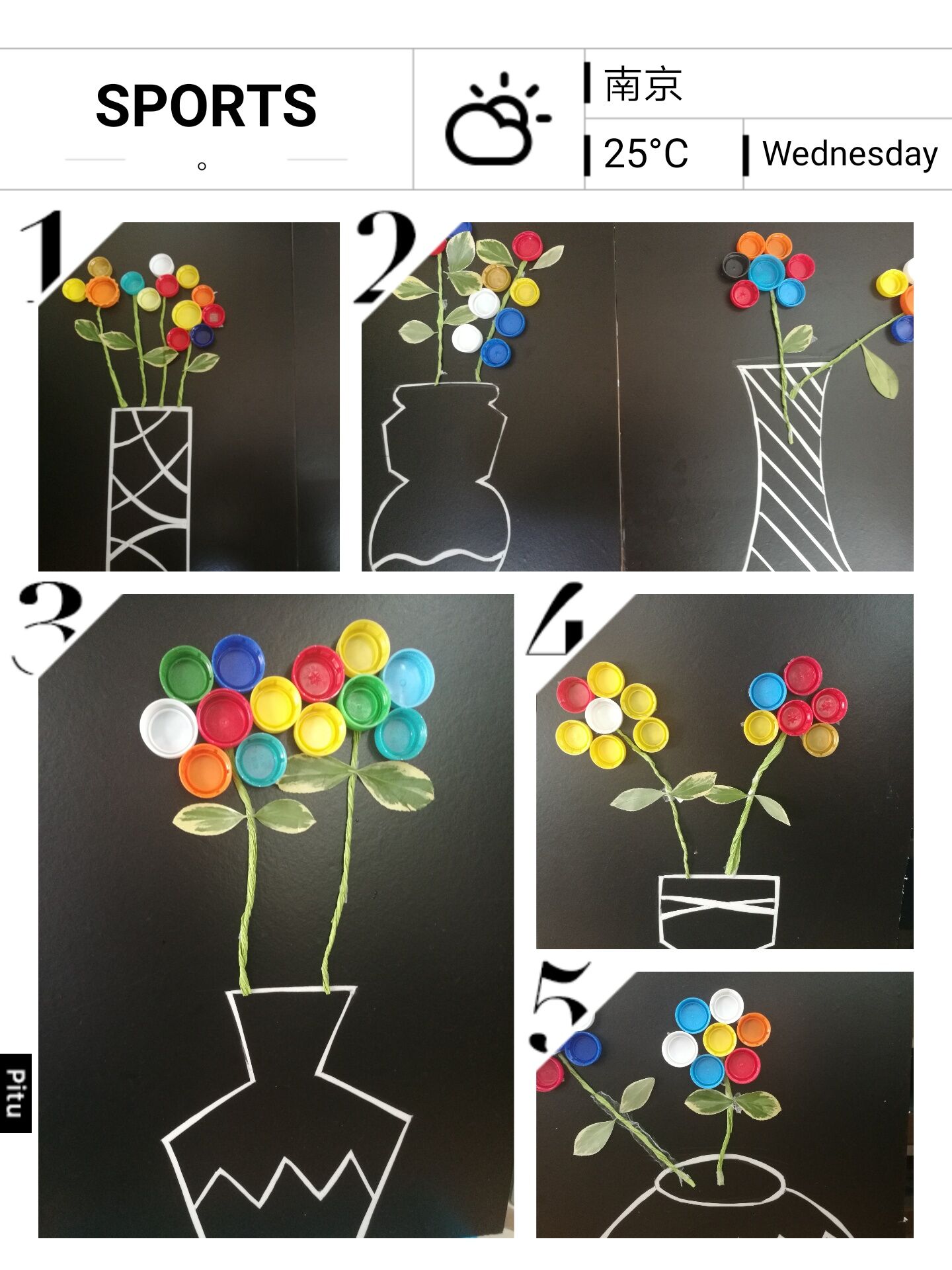 今天带领幼儿们一起用瓶盖发挥想象制作美丽的花,孩子们十分感兴趣,积极参与到活动中,我们一起来看看她们的作品吧!