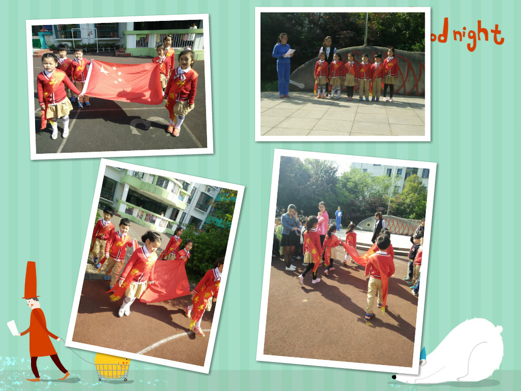 今天又到了我们大四班的小朋友升旗啦!升旗手是顾乐言和李蕊小朋友,护旗手是张浩、李梓菡、徐家成和苏怡然小朋友,他们都是表现很不错的孩子,平常能团结友爱其他小朋友,还能积极举手发言,他们都很棒哦!