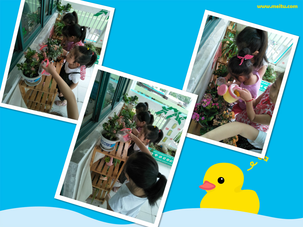 又到了孩子们给自然角的小花浇水的时间啦!瞧,今天的小值日生都拿好了自己的小工具,一个个都在忙着给可爱的小盆花喝水呢!