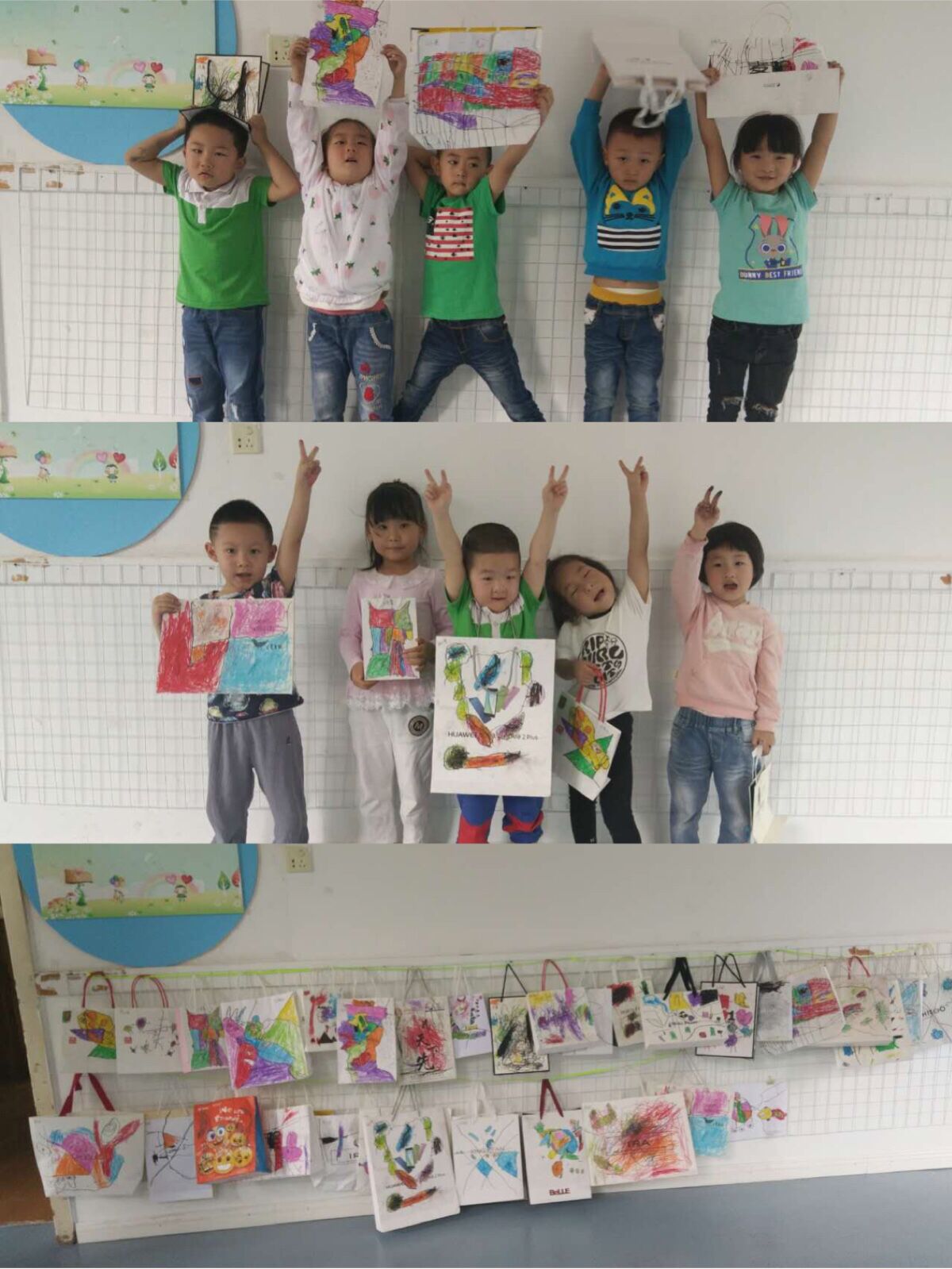 平时妈妈喜欢购物的袋子被我们充分利用了起来,你们看,我们在上面画上了各种线条,还涂上了各种颜色,经过我们亲手打造和装饰,变得好看多了,快来欣赏吧!