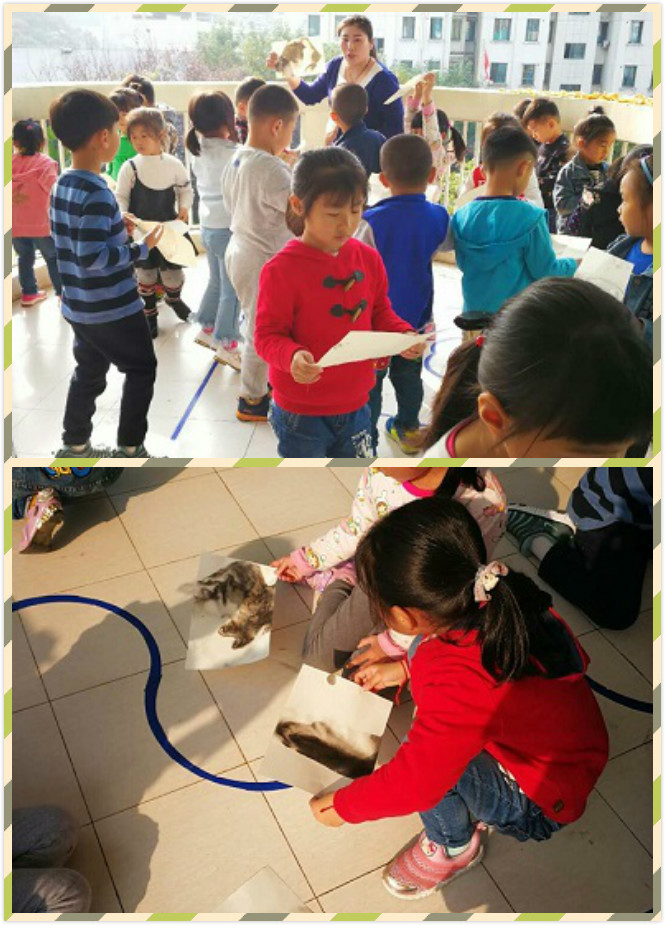 这节活动是将墨滴入流动的水中,当水中呈现出纹路时,将纸平放在水面上印出纹路,这样一个过程就形成了墨晕,最后再让孩子们借型想象用记号笔进行添画,创作属于自己的故事。