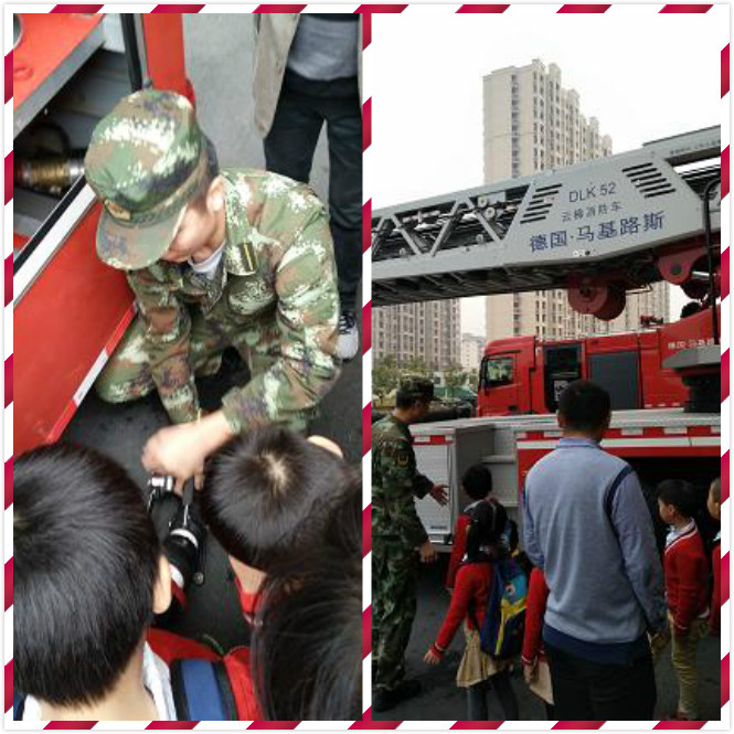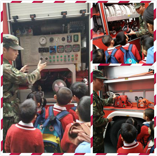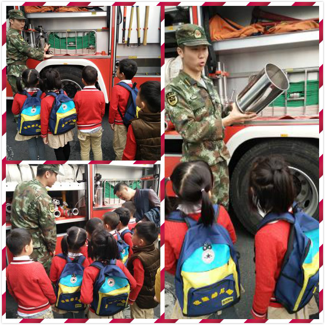 宝贝们带着一颗好奇的心随着老师走进了消防队的大门,带领我们的是一位年轻的消防官兵,孩子们都觉得他好厉害。他先带着我们熟悉了消防车,了解了消防车里的所有物品,有灭火器、水枪、泡沫枪、切割机、抽水机等等,真的就像一个大大的工具箱啊~!最后他又向我们介绍了云梯车,好威武啊,孩子们都目瞪口呆了,回过神来后,孩子们都不停的问东问西的,消防员叔叔都回答不过来了~!