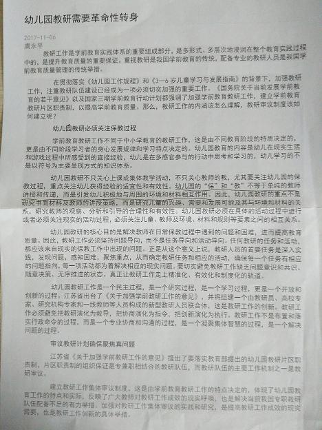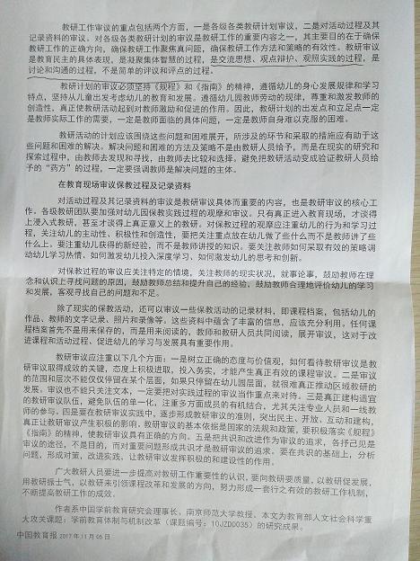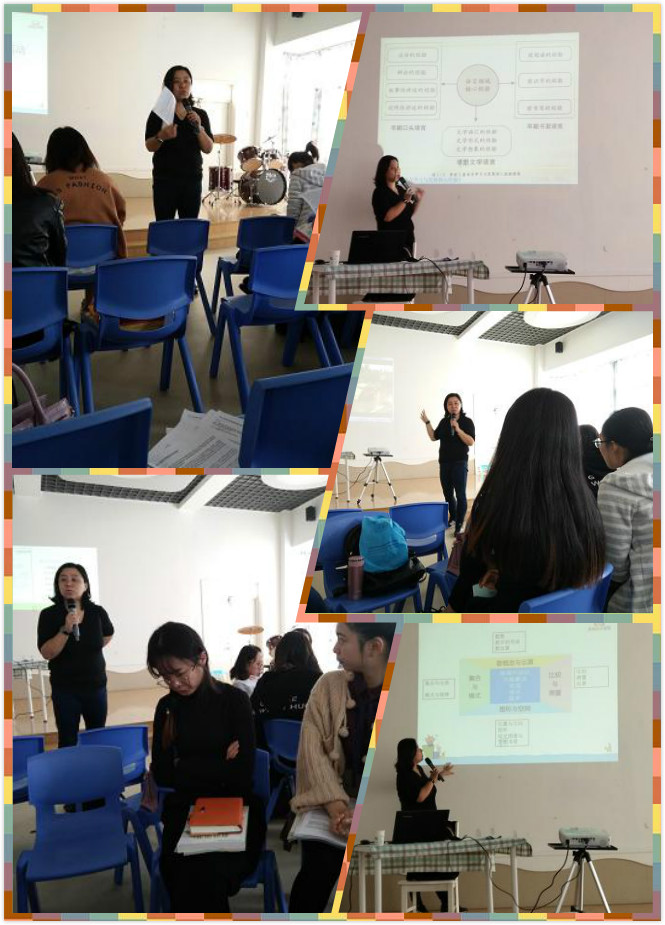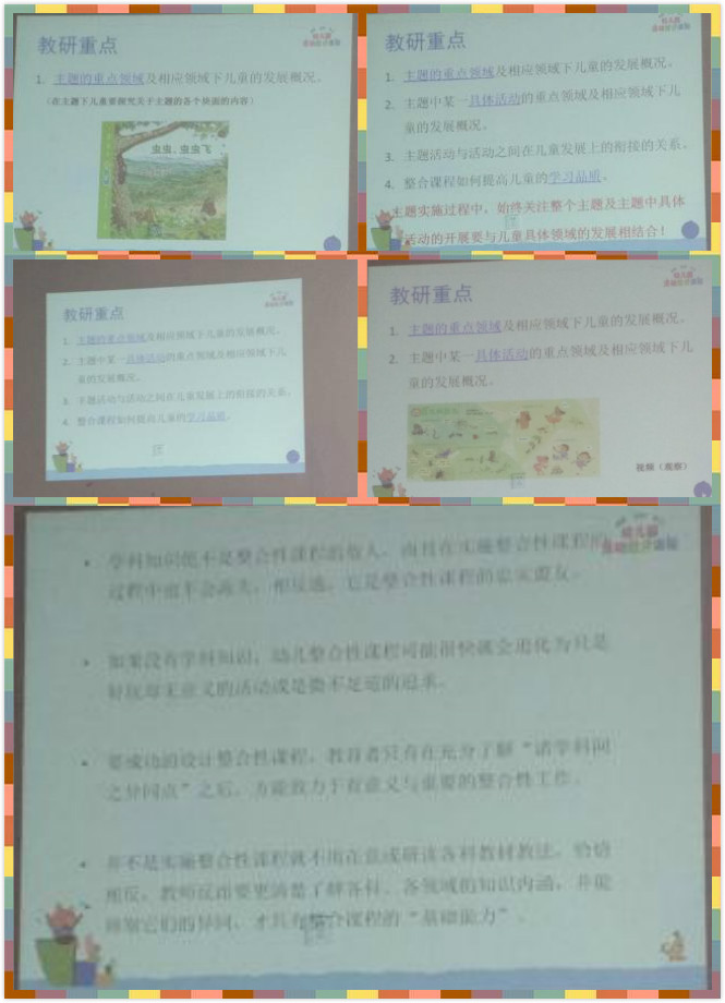 活动一开始,东老师给我们每人发了一份《幼儿园教研需要革命性转身》的一篇文章让我们进行讨论,然后每人在文章中找一段印象较深刻、或是自己有何感想的句子读处来,并和大家分享自己的想法。接下来,东老师带领我们跟随PPT对我们的整合课程进行了探讨,并重点讨论了活动过程中的内容、目标、领域的不同概念,并对三个层次的意思做了详细的分析与讲解,让我们受益良多。