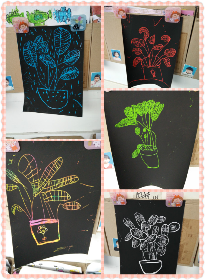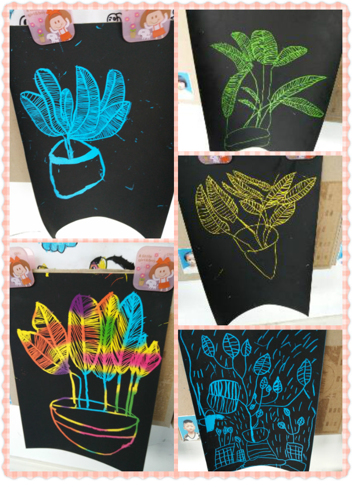 这是用刮画纸进行自然角的植物写生,孩子们把植物的纹理和花茎都刻画出来了,多美啊~!
