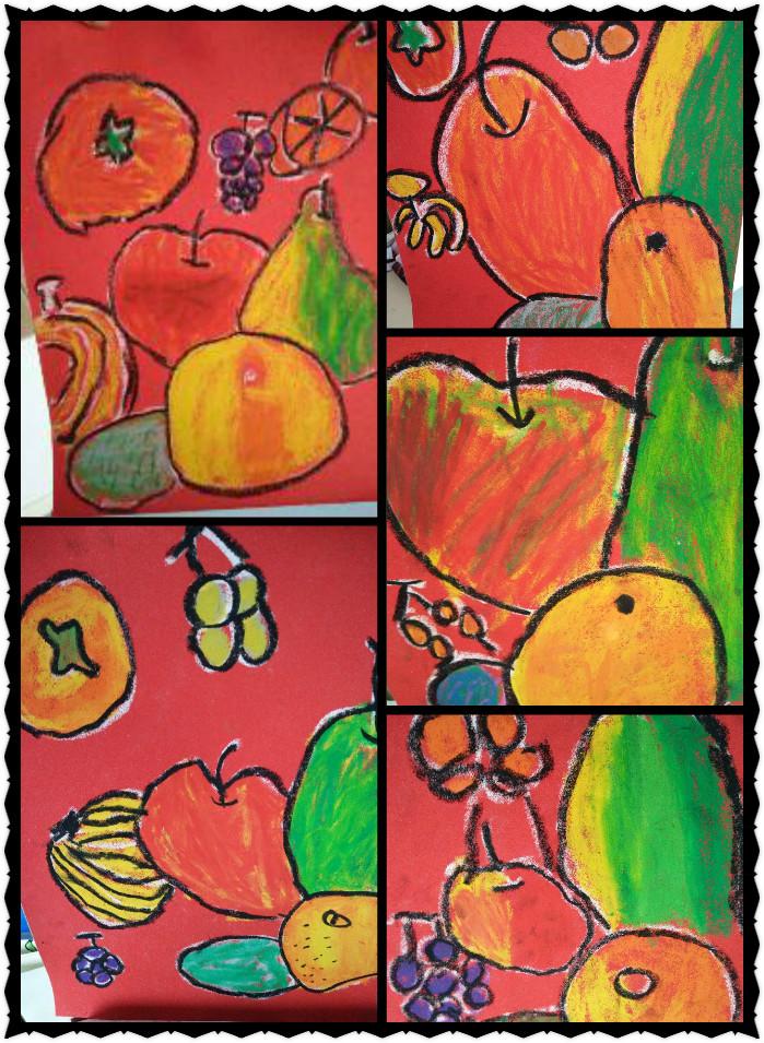下面是孩子们的砂纸画,这种画重点是让孩子们学习复色涂法,用各种颜色的油画棒“你背我来我背你”相互叠加起来出现的效果,瞧,我们的孩子们好帮呀!