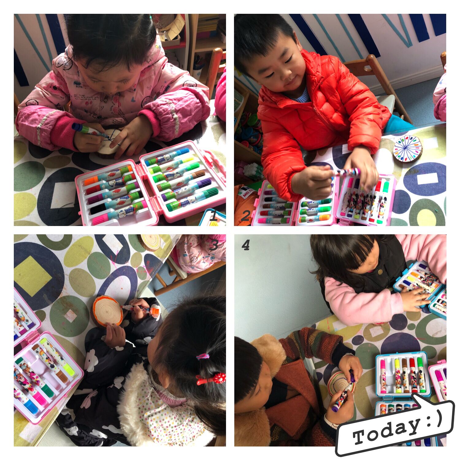 今天美工区的孩子们又有了一种新的可以用来绘画的工具,结合主题拜访大树,我们利用了木桩切成的木片让孩子们在上面进行简单的装饰,孩子们有的用线面装饰,有的用图案装饰,大家都很不错呢!