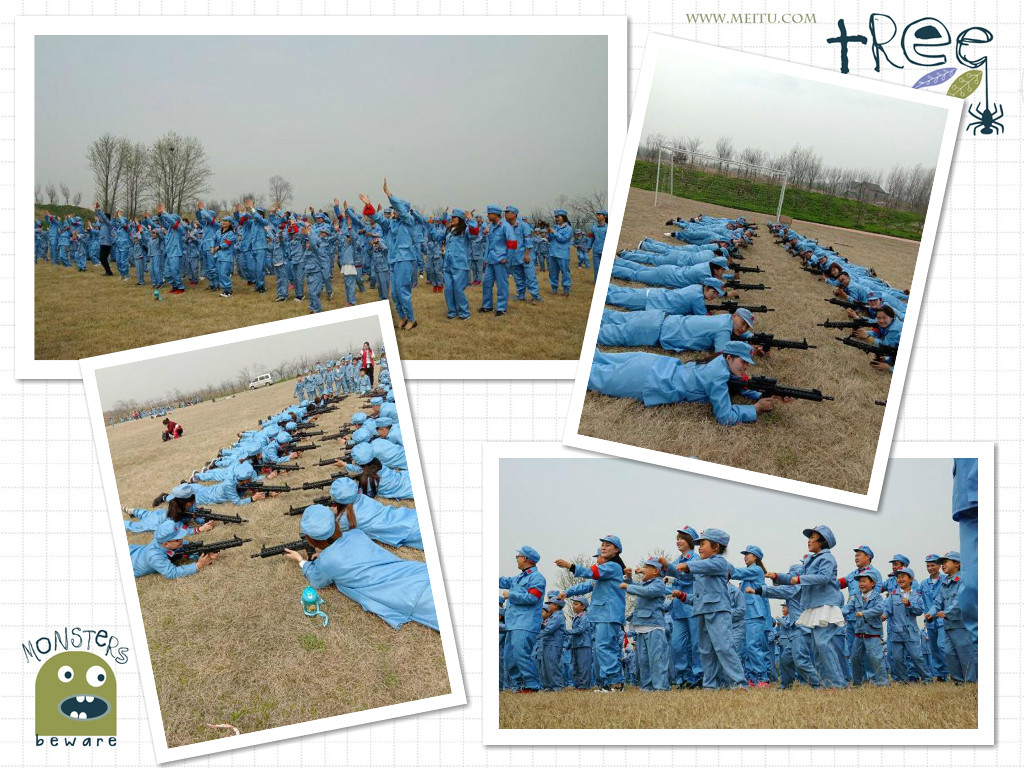 在这次活动中,孩子们和爸爸妈妈们一起穿上了红军的服装体验了红军的生活,也模仿了红军的战场训练,孩子们个个精神抖擞,训练时不怕苦、不怕晒,真的像小红军呢!~