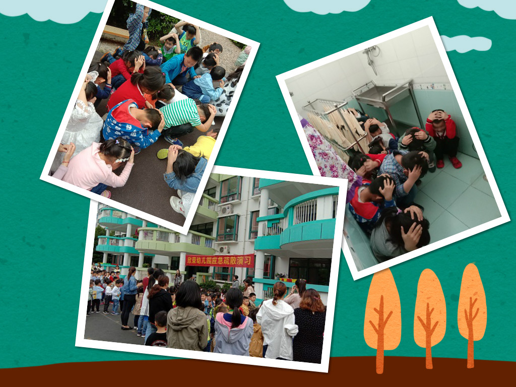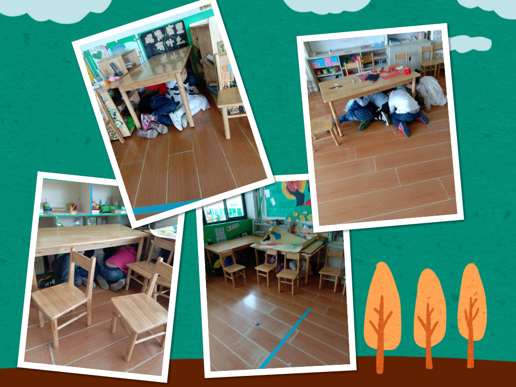 今天我园开展了防震演习活动,在防震演习的前一天,我们事先跟孩子们普及了防震知识,孩子们都知道了当发生地震时要就近躲避,并要想办法保护自己。今天上午当警报声响起时,孩子们立刻放下了手上的物品,有的迅速地躲到了桌子下面,有的则躲到了厕所的墙角处,当警报声停止时,孩子们又用最快的速度有序的双手抱头跑到了操场上,为孩子们的勇敢、机智点赞!~