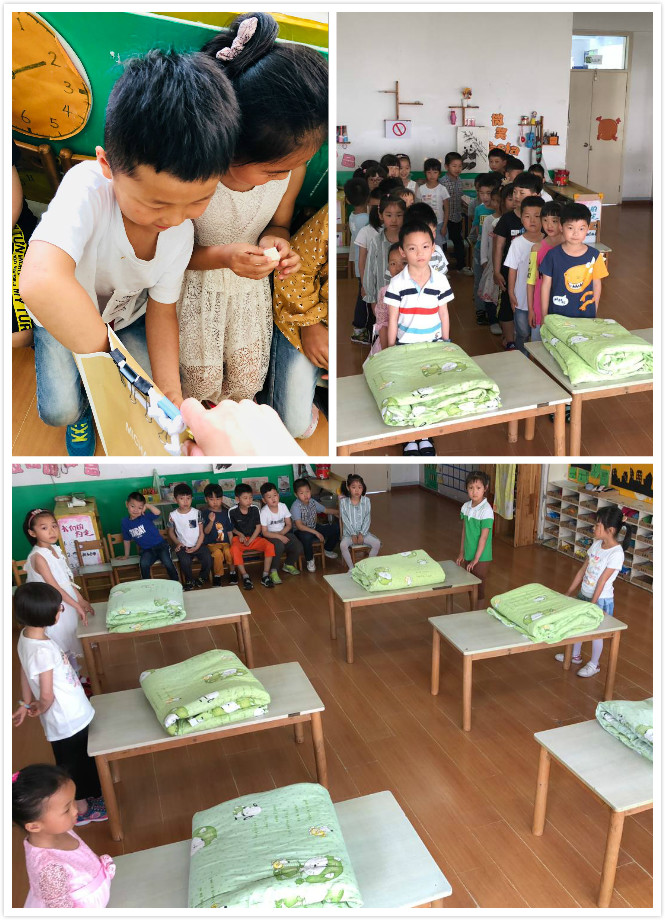 这周我们大班进行了自我服务——叠被子比赛,小朋友们抽签根据颜色分成一组,同组幼儿进行比拼,看谁叠的又快又好,孩子们非常积极加入其中,我们也给获得第一的孩子给予了奖励。