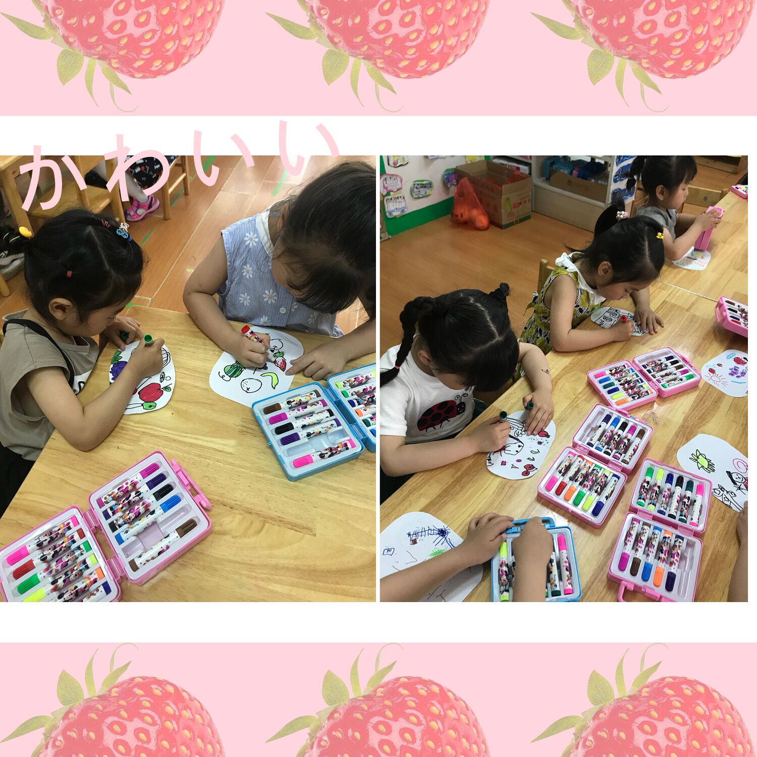 本月我们进入了《水果多多》的主题教学活动,今天下午区域游戏时,好多孩子选择了在美工区画水果,看看这些小画家们,多认真!