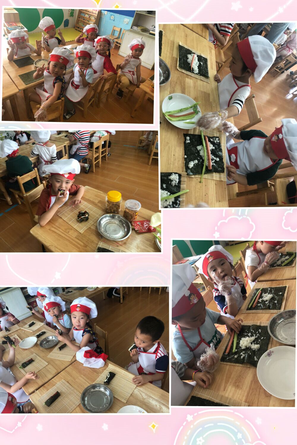 耿子航妈妈对于手工食物方面特别的有兴趣,之前带孩子们做了面点这一次带孩子们做了寿司,还给每个小朋友准备了小围裙和厨师帽,有很多孩子们都是第一次做寿司,因此对于怎么做寿司特别的好奇,看着这一个个小厨师有模有样的样子实在是在可爱了!哇~自己做的就是香,我要把它吃光光~~~