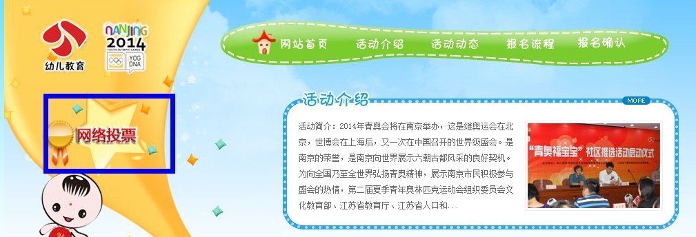 1.点击http://www.fbb365.com/youer/进入江苏幼儿教育频道青奥福宝宝活动页面后,点击页面左边的 “网络投票”按钮如图1所示。