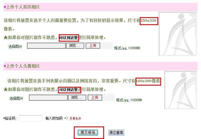 请会员按以下标准上传照片:1)上传个人首页相片,标准尺寸为250*320像素。2)上传个人头像相片,标准尺寸为160*200像素,详见图8。若会员不会修改图片尺寸可以点击下图所示“可以到这里”来完成图片尺寸大小的调整,或求助于当地合作的摄影机构免费完成注册的全过程。