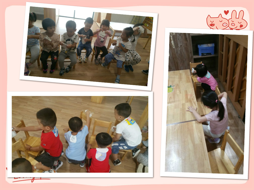 孩子们入园已经四周了,在逐渐适应了新环境的同时,还学会了自我服务。上周我们进行了一节《小椅子擦干净》的集体教学活动。幼儿学会了擦椅子。每天早晨来园都要给自己的小椅子“洗个澡”。