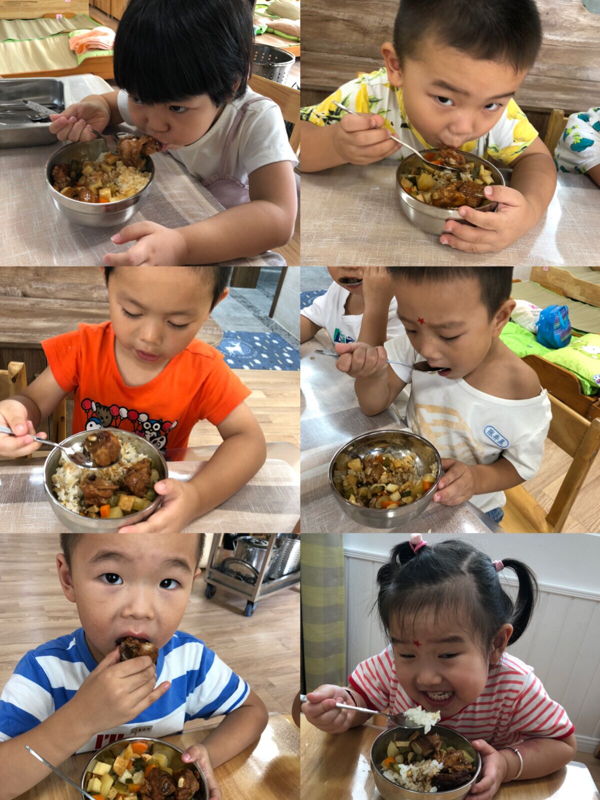入园时的牛仔们情绪很不稳定,多数以哭闹为主,当他们听到吃饭啦,一个个渴望的小眼神好可爱,哭的孩子也立马停止的哭泣,期待着今天的午餐,我们蔡老师把饭打好后,一个个吃的好香啊!看,我们今天吃大排骨!看我那得意的小眼神,是你不曾拥有哦!每次午餐时间也是我们牛仔们享受的时间,请不要在我们享受午餐时打扰我们哦!